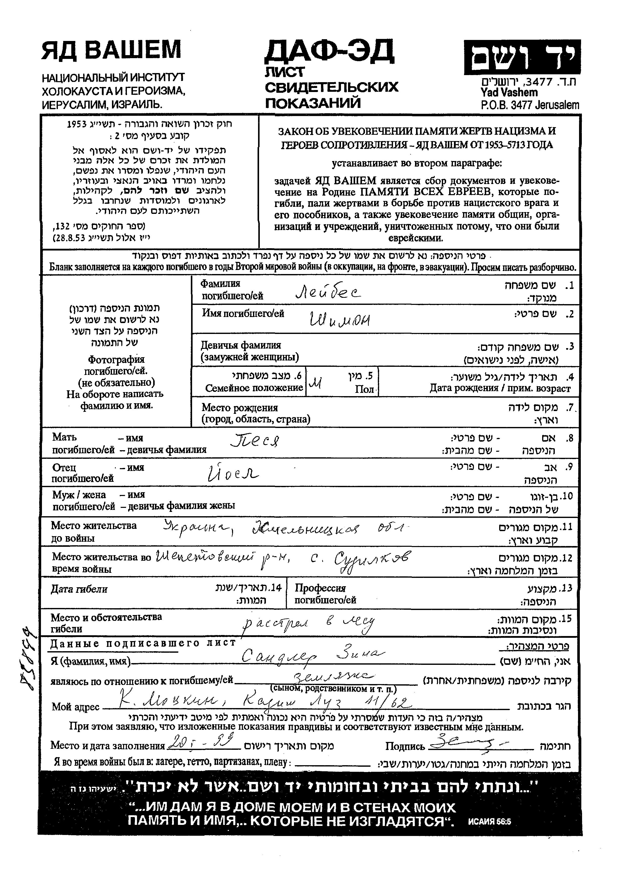 Leibes Shimon Khmelnitski, Ukraine (URSS) Feuille de témoignage