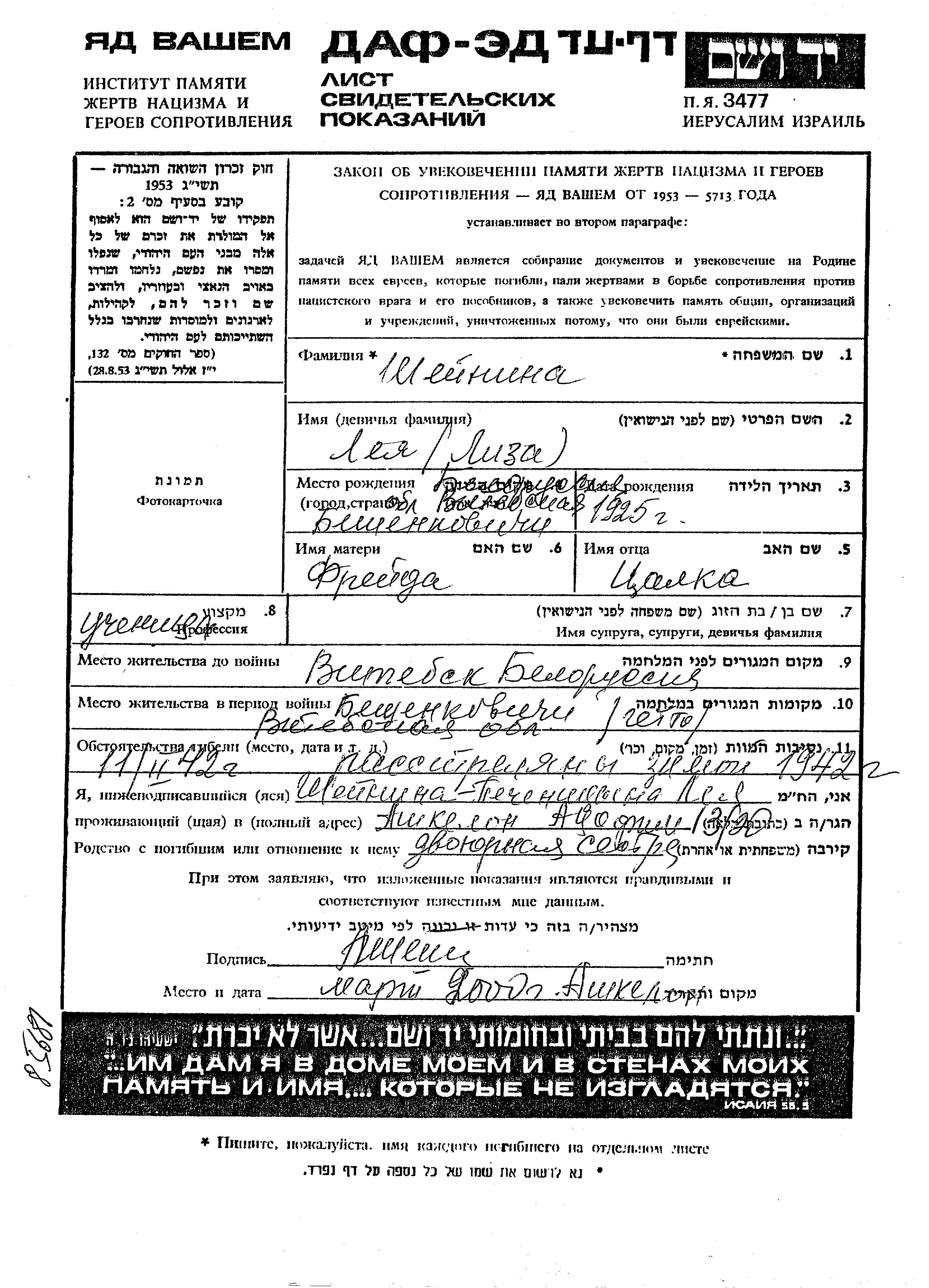Sheinina Leya Liza 1925 Vitebsk, Bélorussie (URSS) Feuille de témoignage