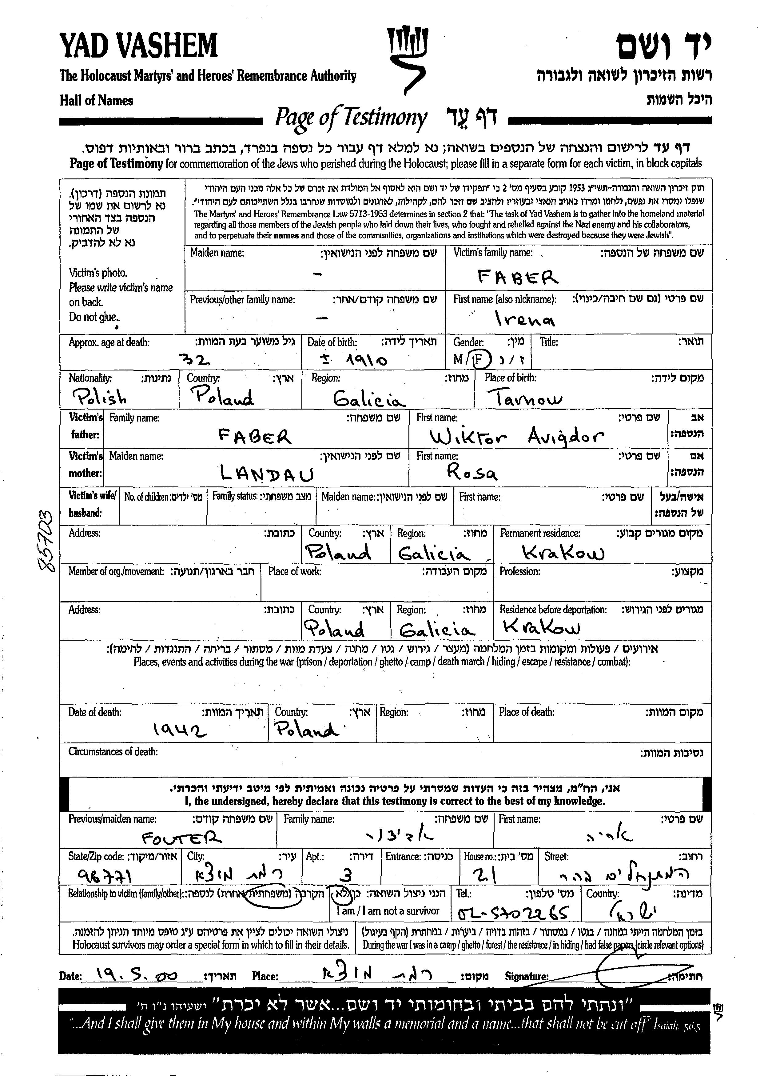 Irena Faber est née à Tarnow, Pologne en 1910, fille de Wiktor Avigdor et de Rosa. Avant la seconde guerre mondiale elle vivait à Krakow, Pologne. Pendant la guerre, elle était à Krakow, Pologne.