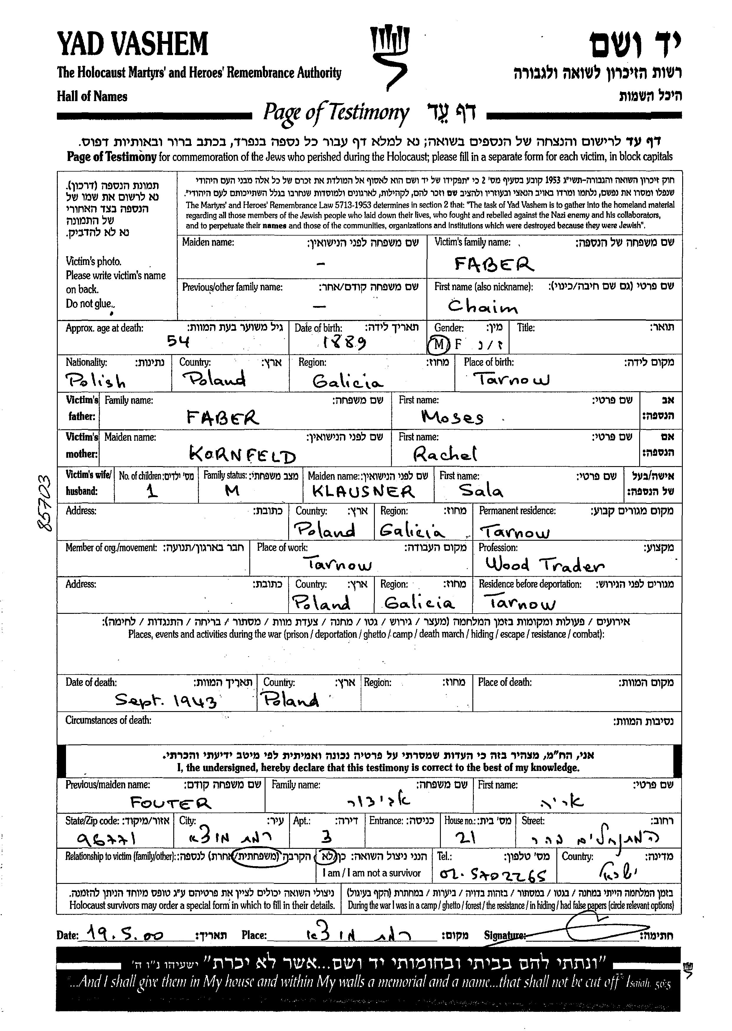 Chaim Faber est né à Tarnow, Pologne en 1889, fils de Moses et de Rachel. Il était Négociant en bois et Mariée à Sala née Klausner. Avant la seconde guerre mondiale il vivait à Tarnow, Pologne. Au cours de la guerre, il était à Tarnow, Pologne.