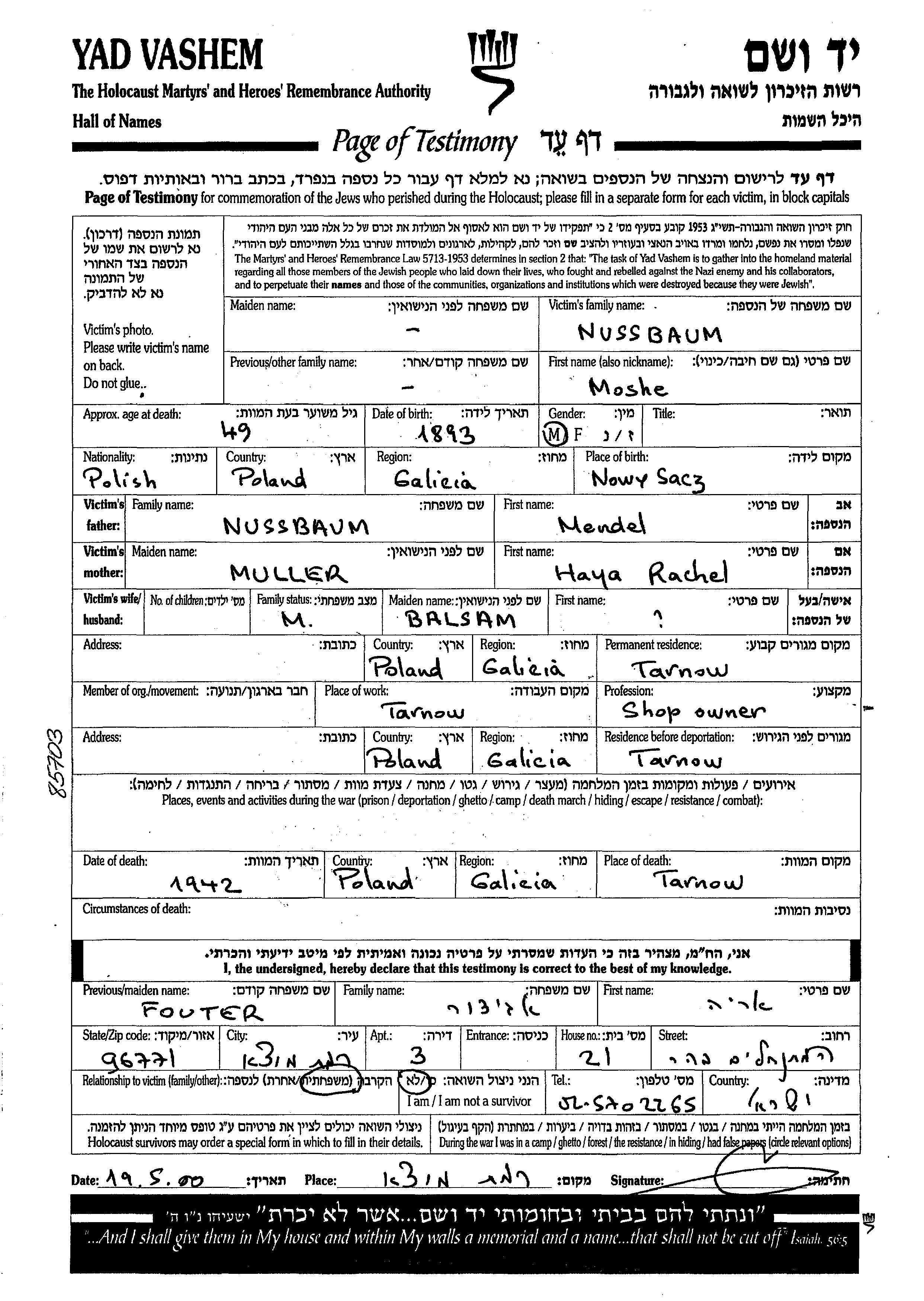 Nussbaum Moshe 1893 Tarnow, Pologne Feuille de témoignage