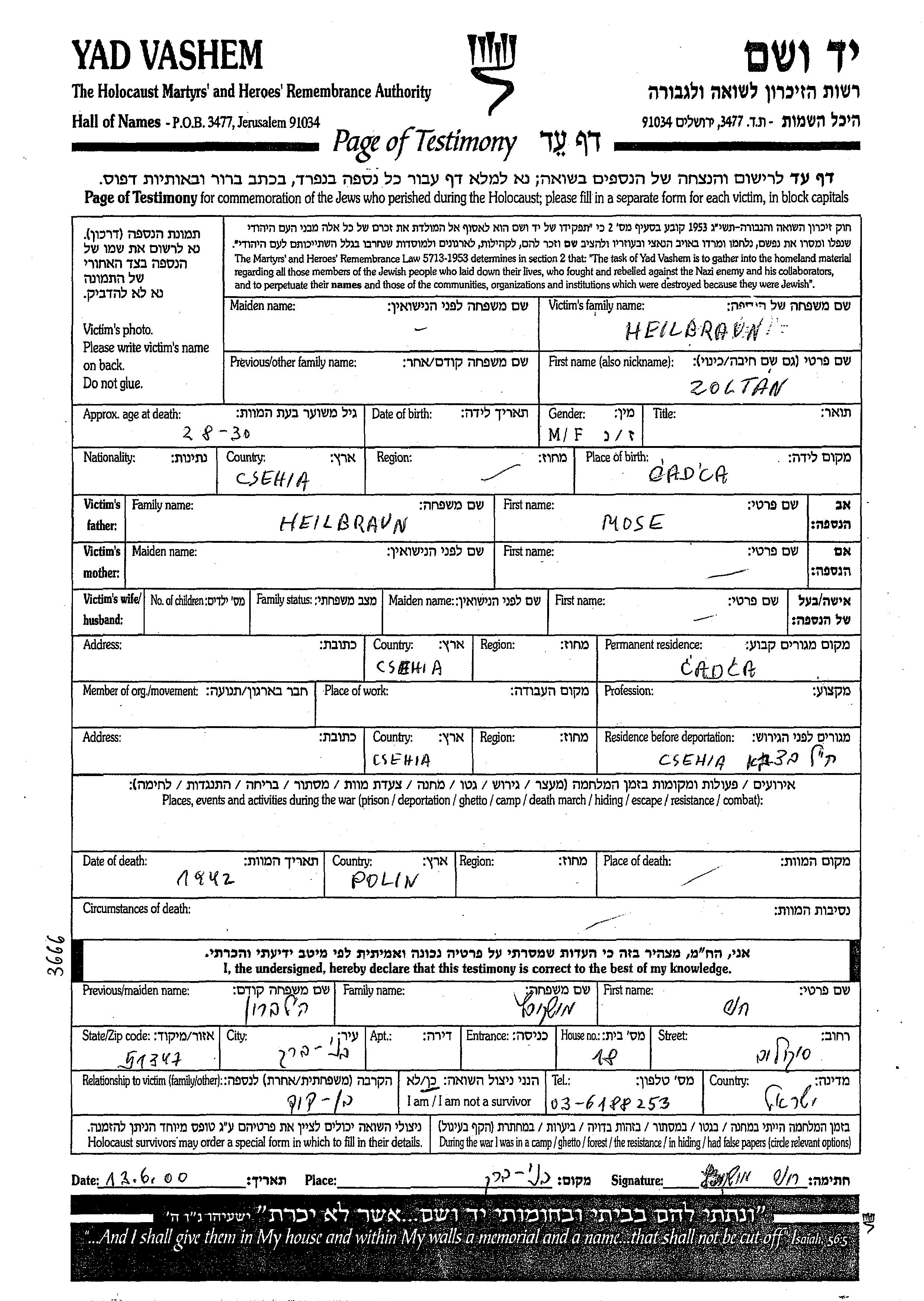 Zoltan Heilbraun est né à Cadca, Tchécoslovaquie, fils de Mose. Il était Soldat. Avant la seconde guerre mondiale il vivait à Cadca, Tchécoslovaquie. Au cours de la guerre, il était à Tchécoslovaquie.