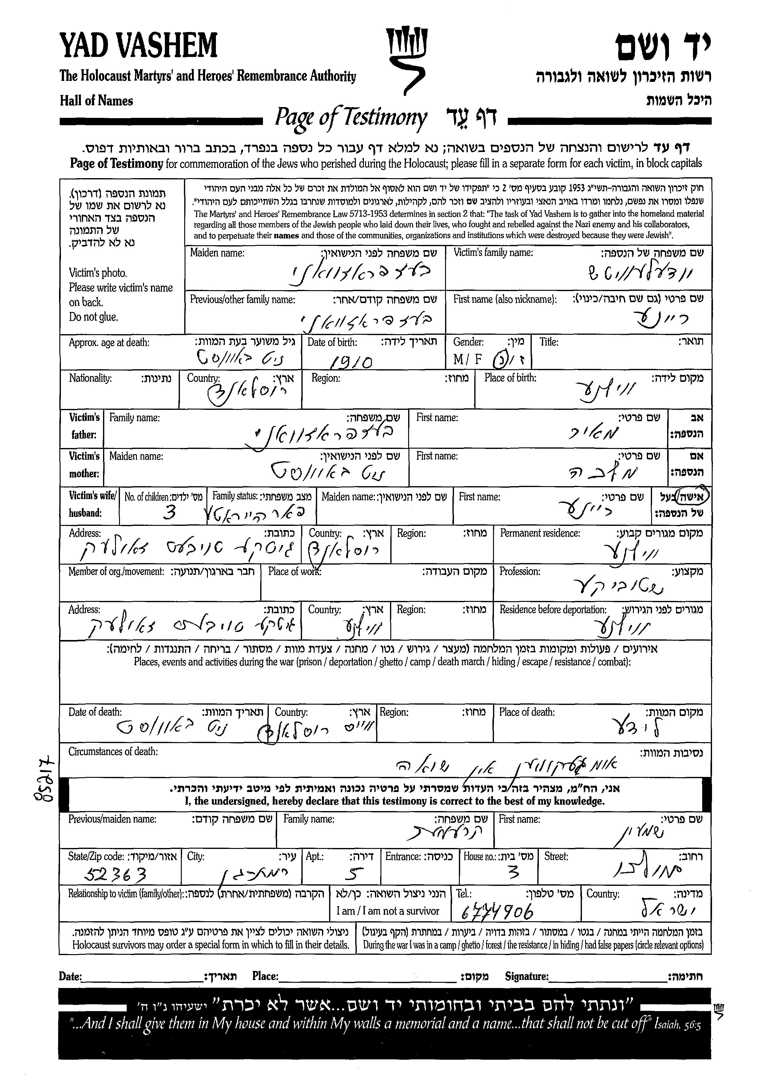 Yad Vashem - Pages of Testimony Names Memorial Collection