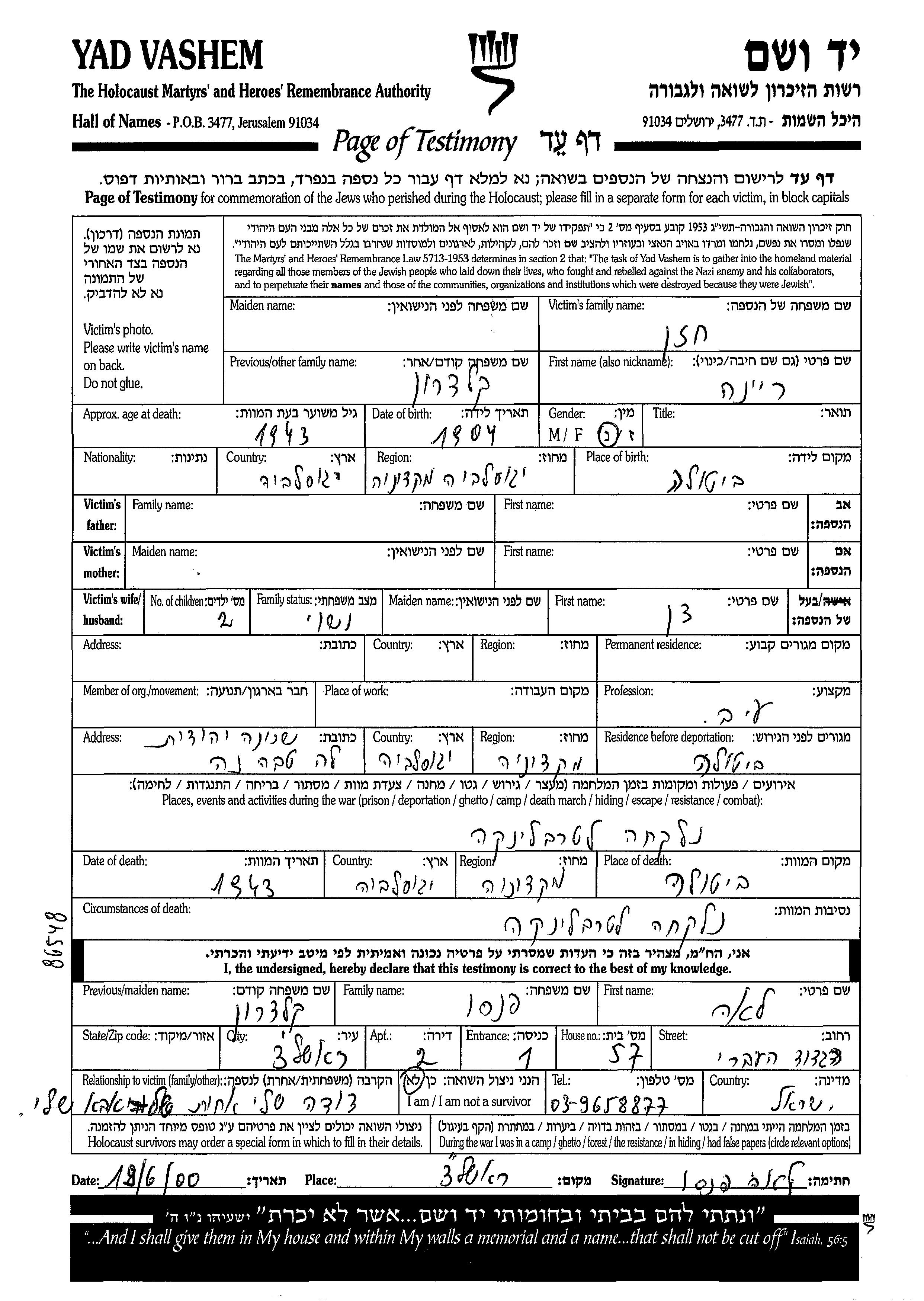Yad Vashem - Pages of Testimony Names Memorial Collection