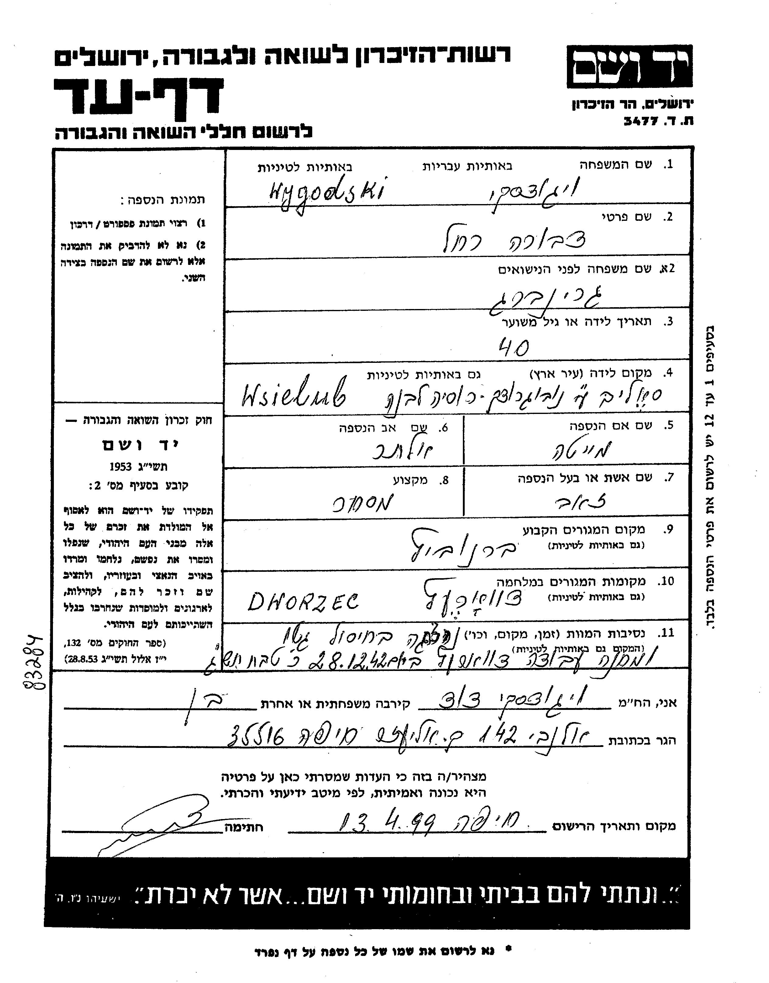 Wygodski Dvora Rakhel 1902 Baranowicze, Pologne Feuille de témoignage