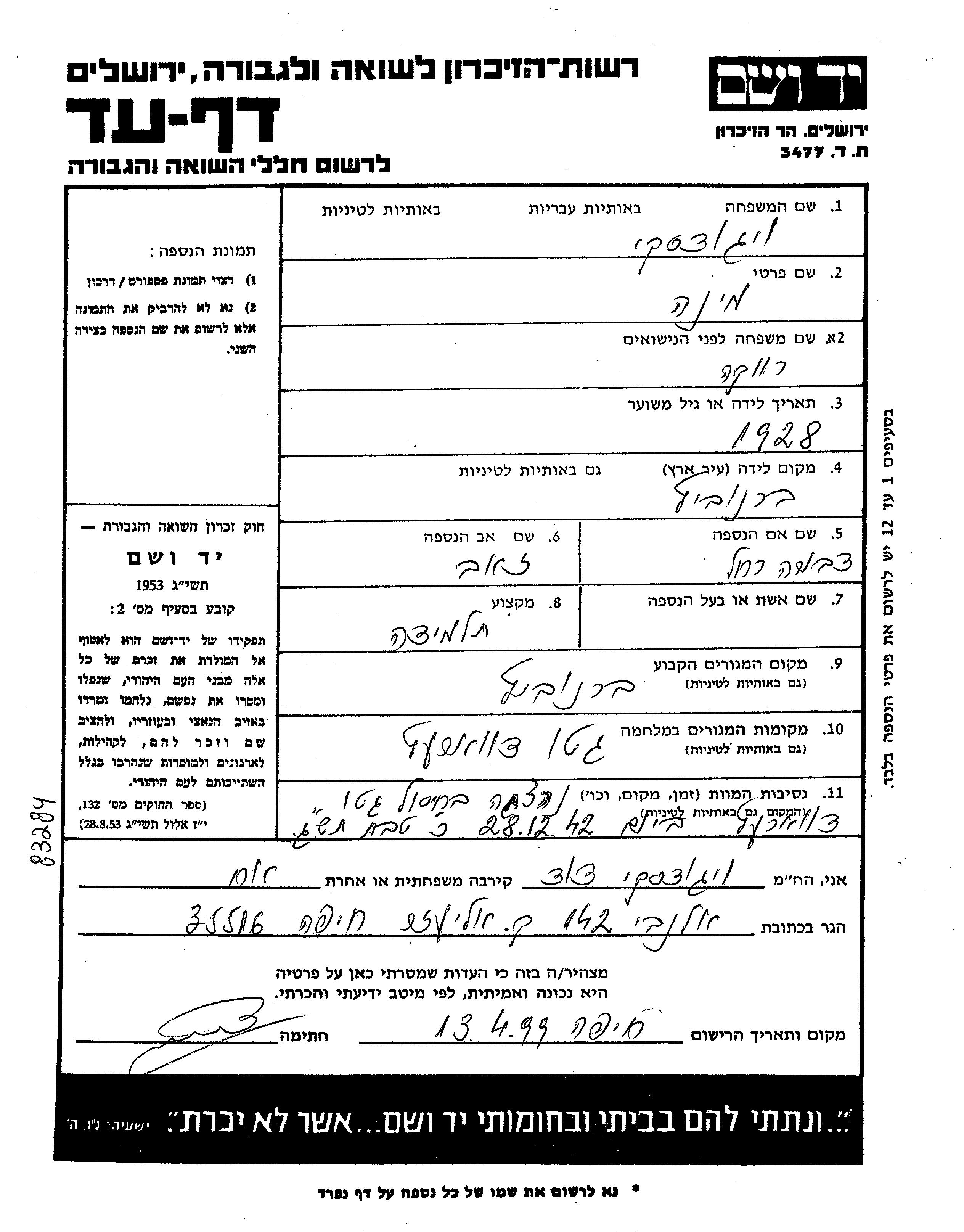 Wygodzki Mina 1928 Baranowicze, Pologne Feuille de témoignage