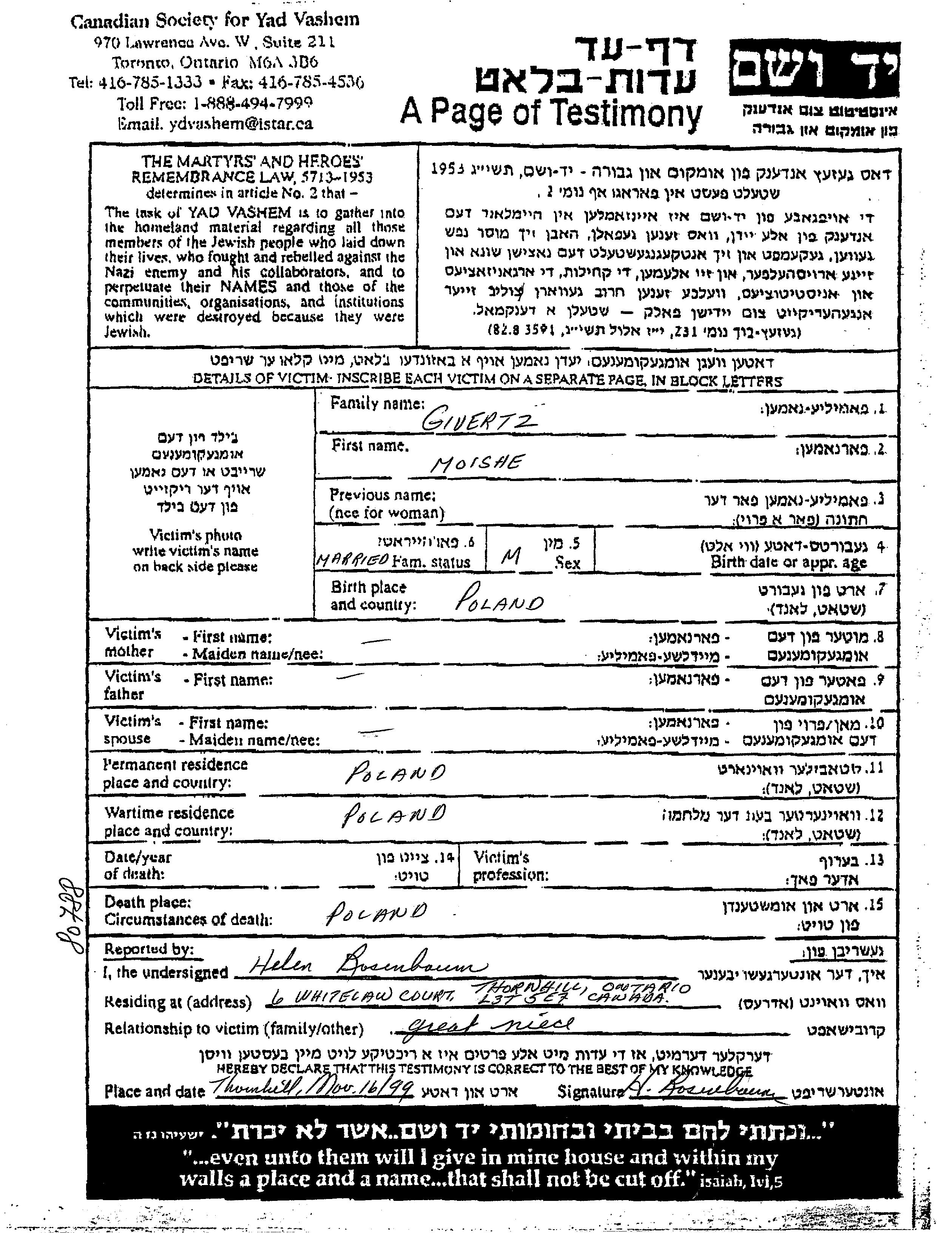 Moishe Givertz est né à Pologne. Il était Marié. Avant la seconde guerre mondiale il vivait à Pologne. Au cours de la guerre, il était à Pologne.