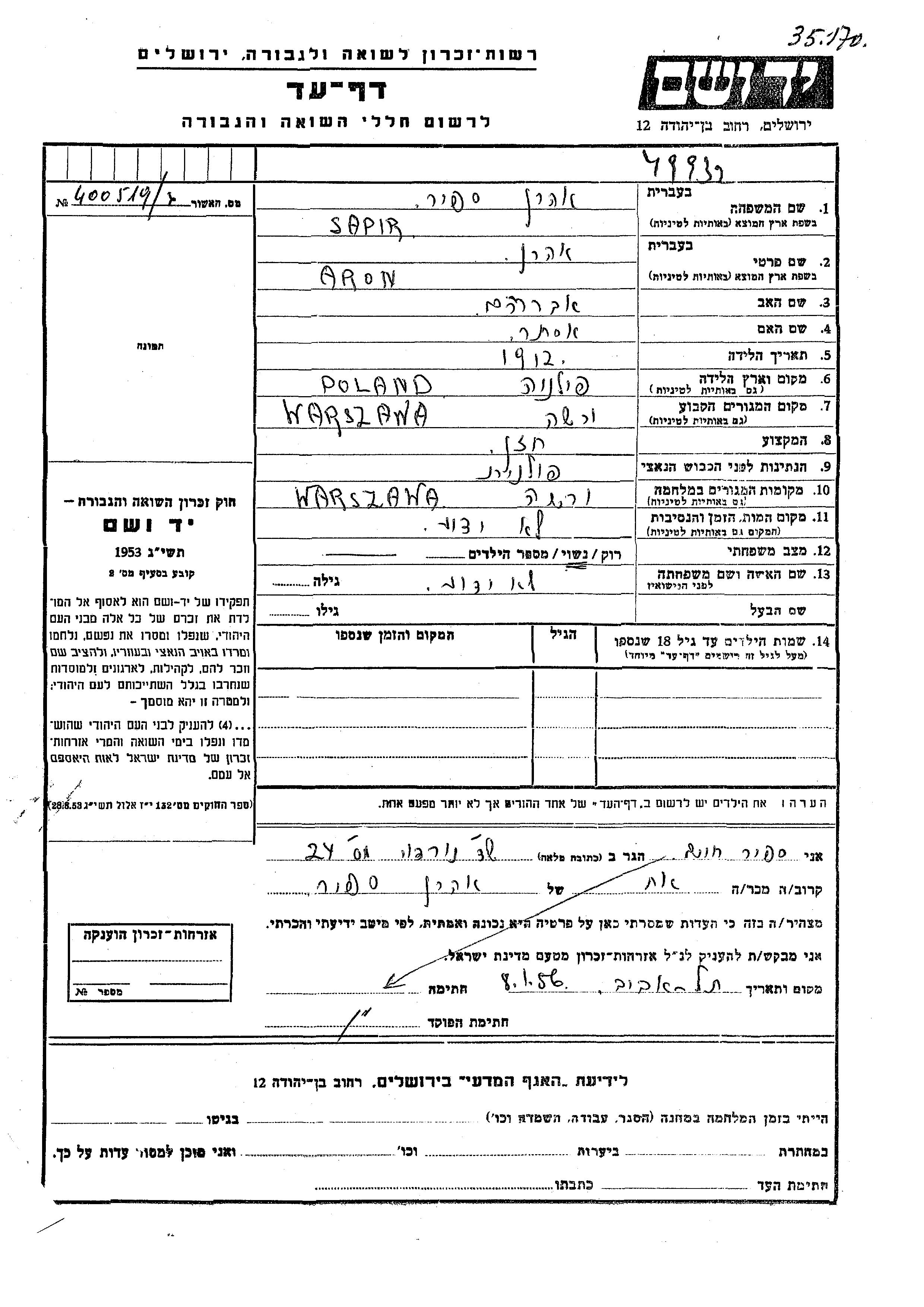 Sapir Aron 1912 Warszawa, Pologne Feuille de témoignage