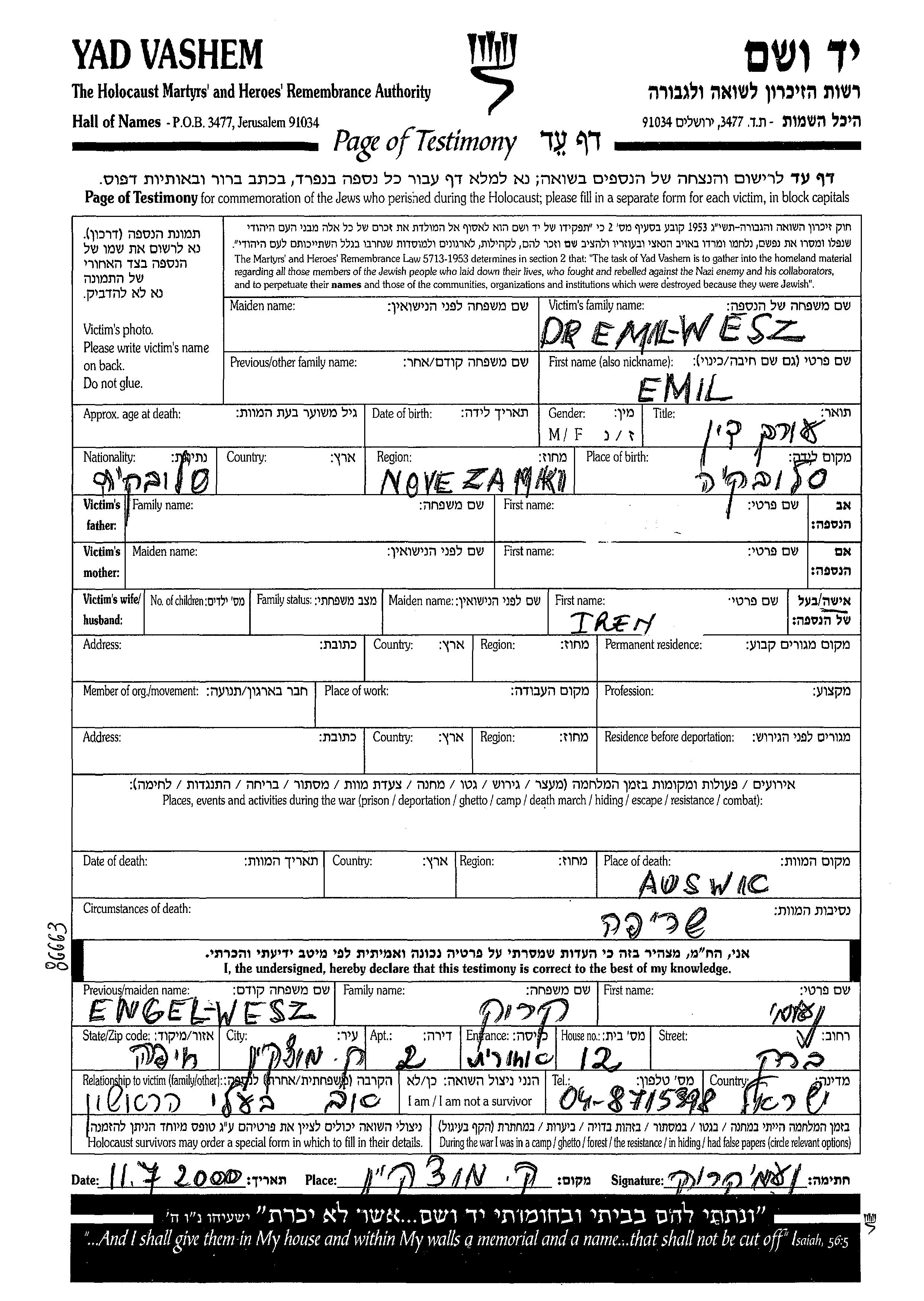 Wesz Emil endroit inconnu, Feuille de témoignage