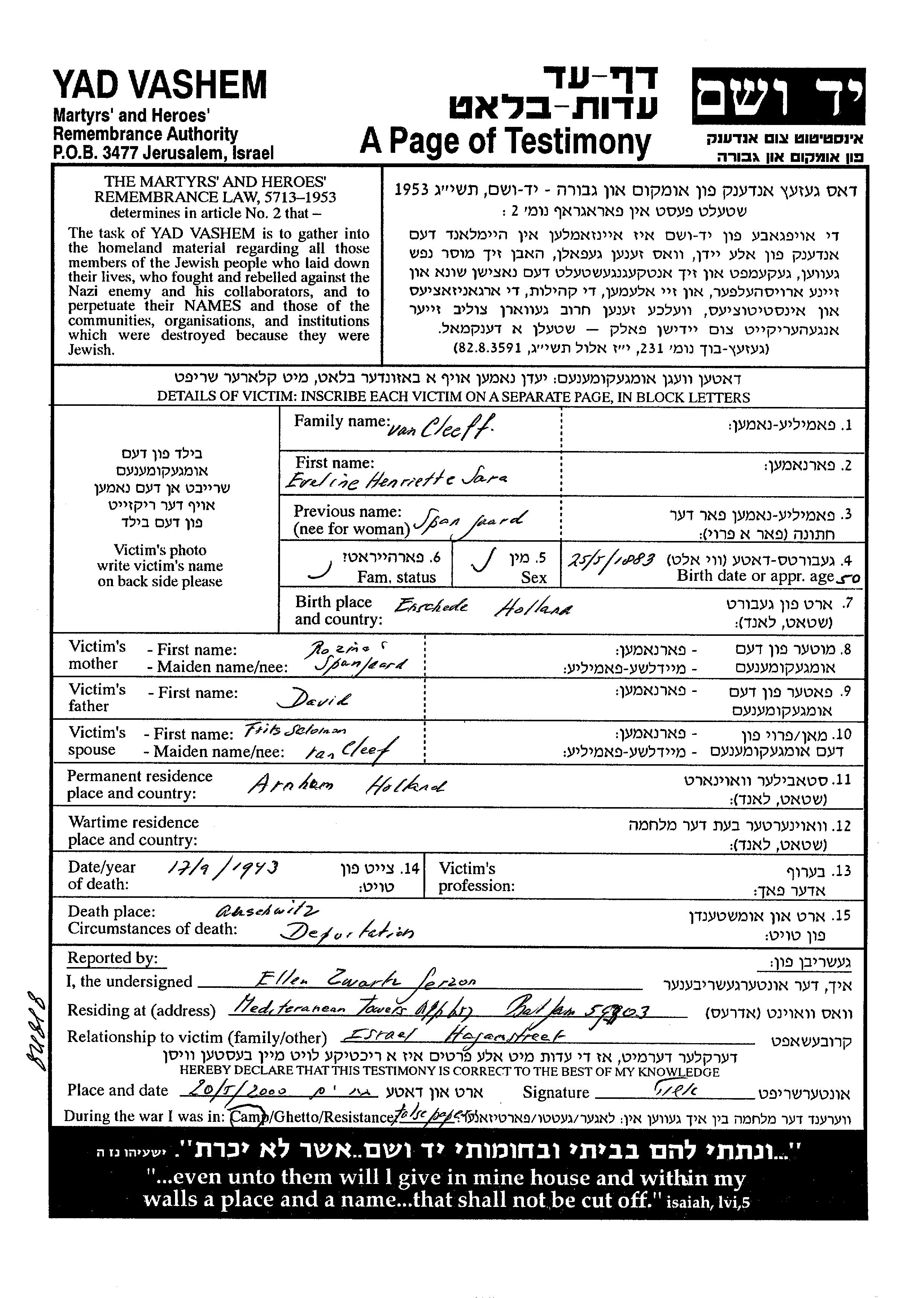 Eveline Henriette Sara Cleeff van née Spanjaard est née à Enschede, Pays-Bas en 1883, fille de David et de Roza. Elle était Mariée à Frits Solomon née Cleef van. Avant la seconde guerre mondiale elle vivait à Arnhem, Pays-Bas.