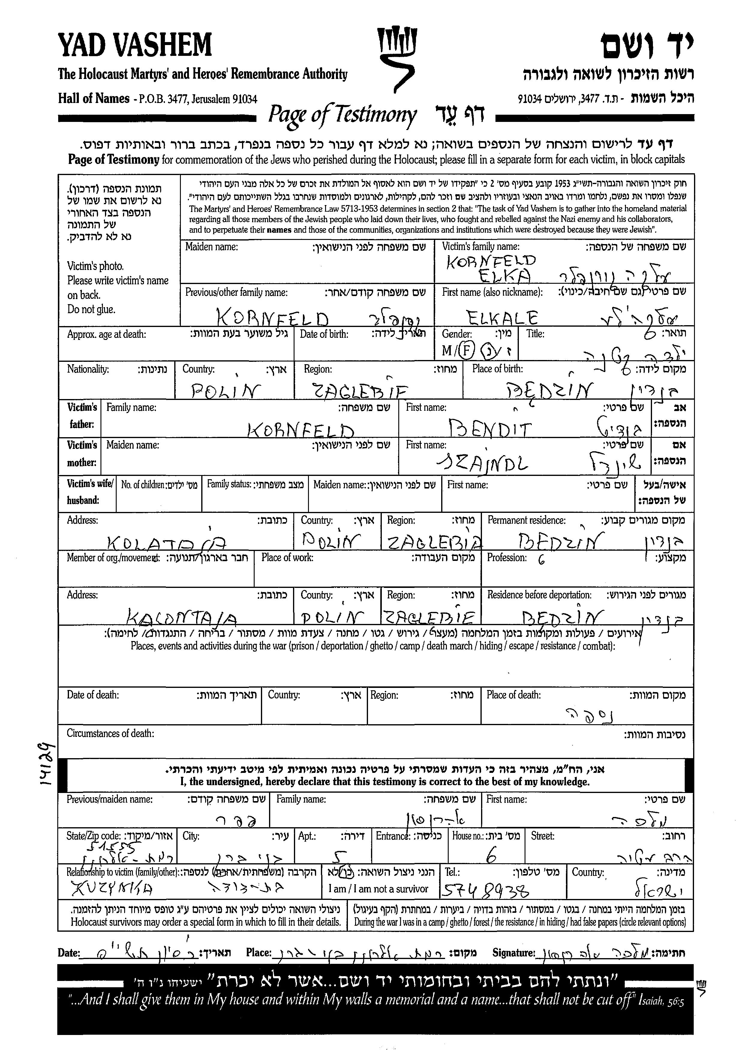 Kornfeld Elka Będzin, Pologne Feuille de témoignage