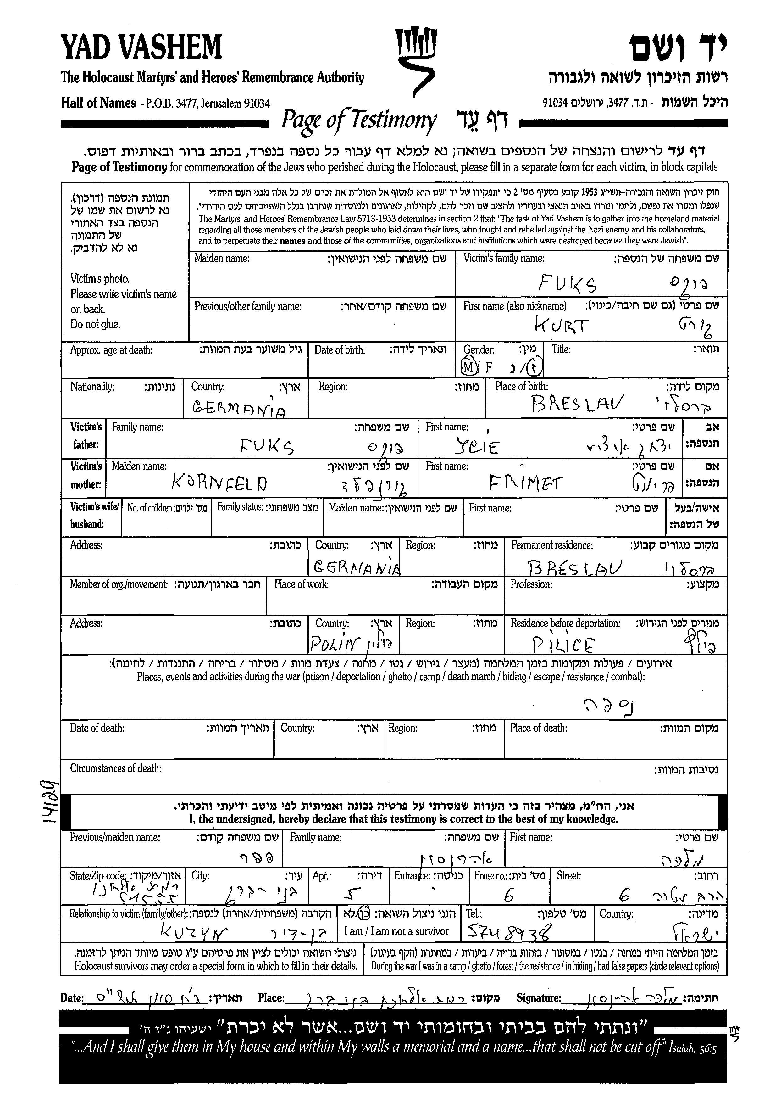 Fuks Kurt Breslau, Allemagne Feuille de témoignage