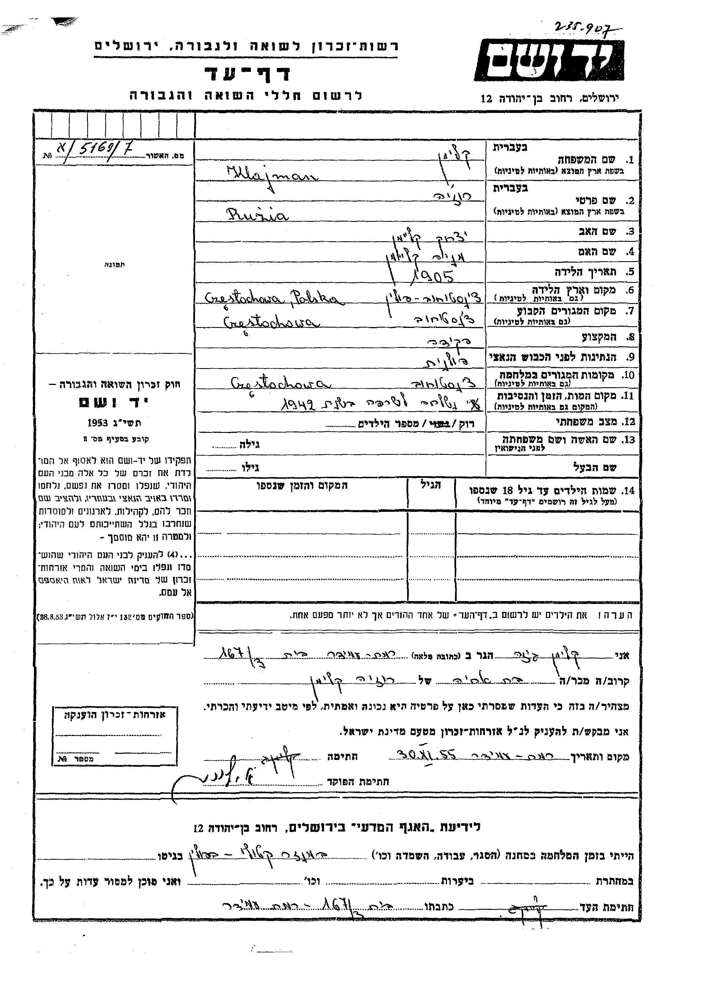 Klajman Ruzia 1905 Czestochowa, Pologne Feuille de témoignage