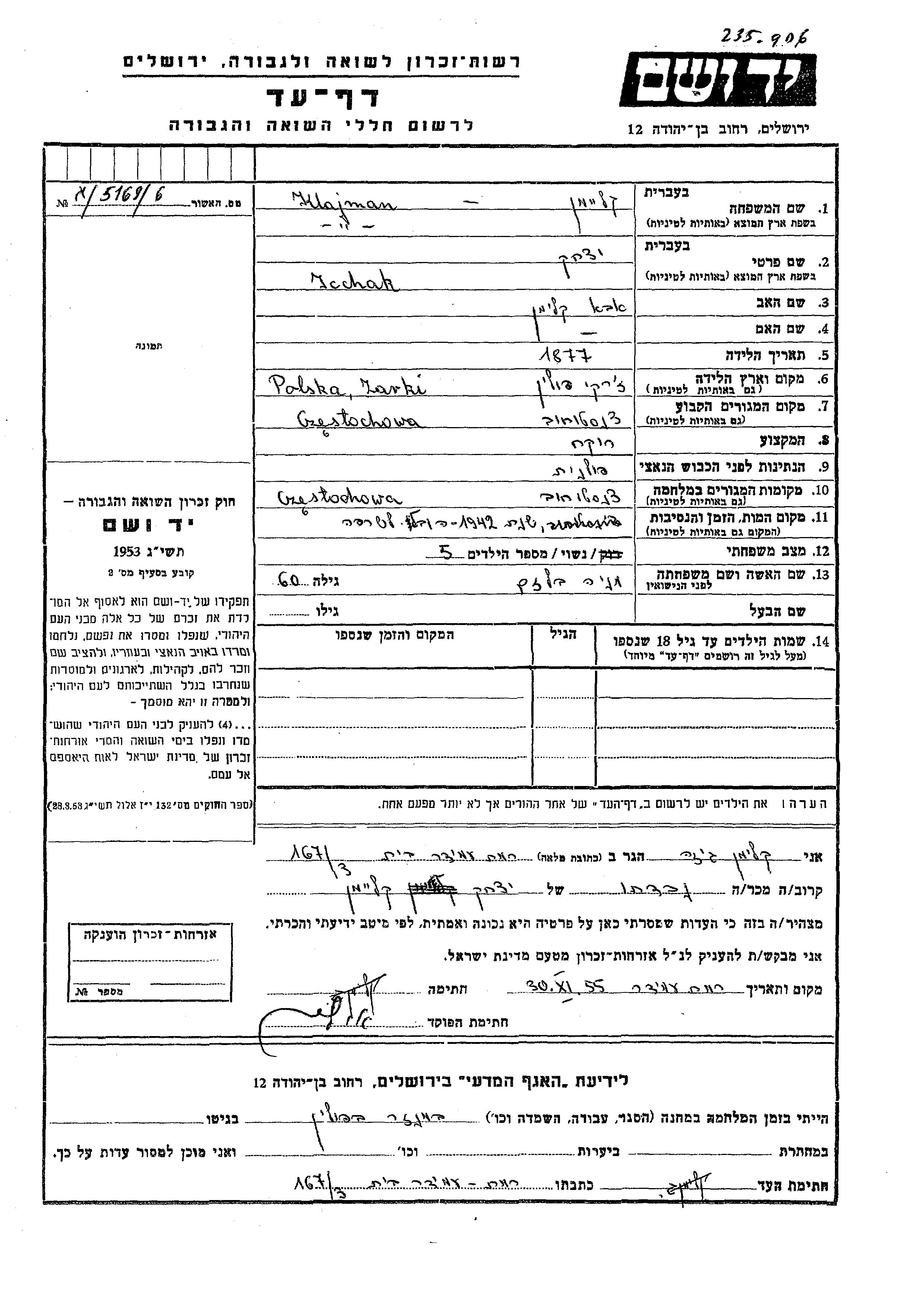 Klajman Icchak 1877 Czestochowa, Pologne Feuille de témoignage
