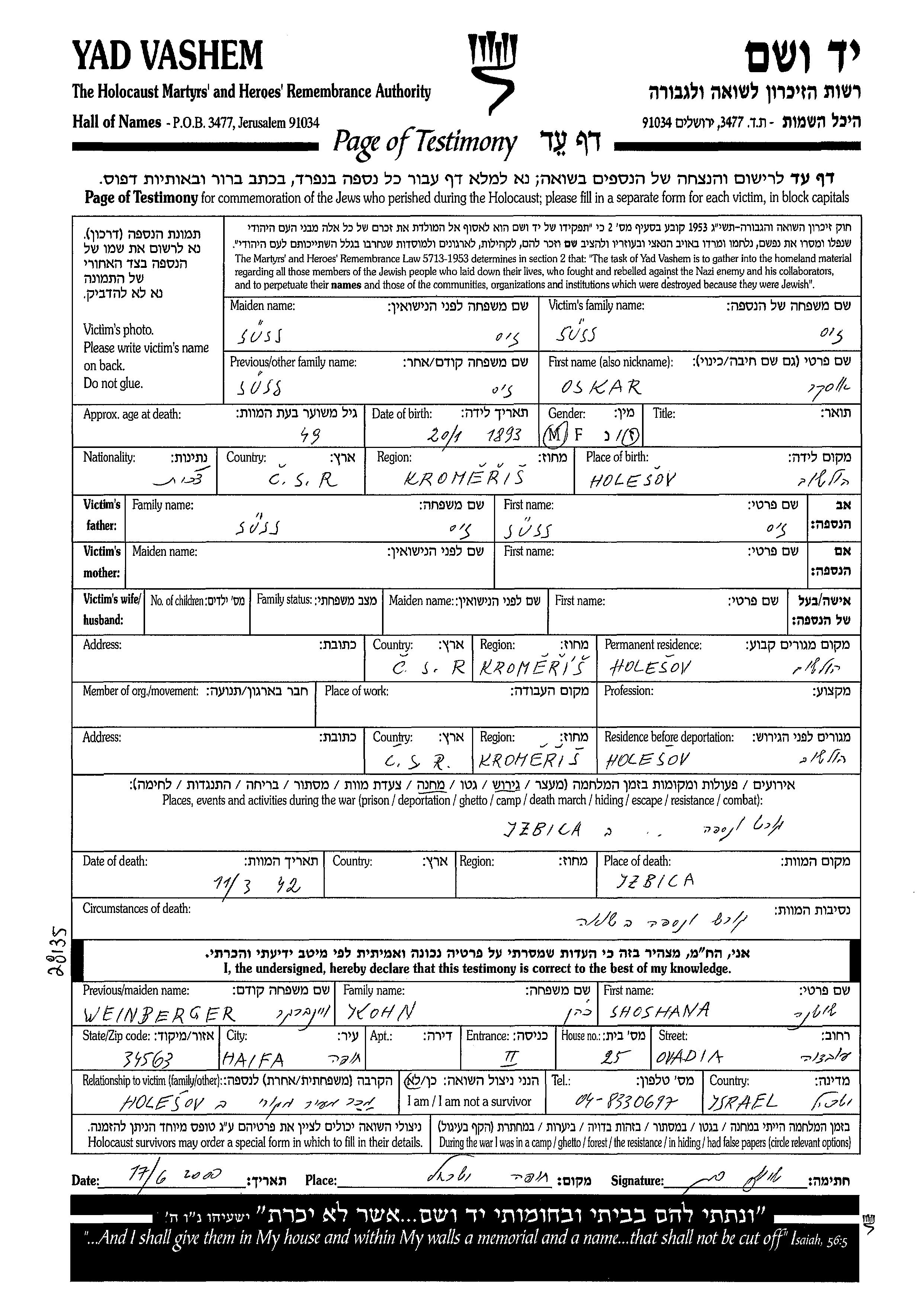 Oskar a été assassiné pendant la Shoah. Lieu de la mort: Izbica, Pologne en 1942.