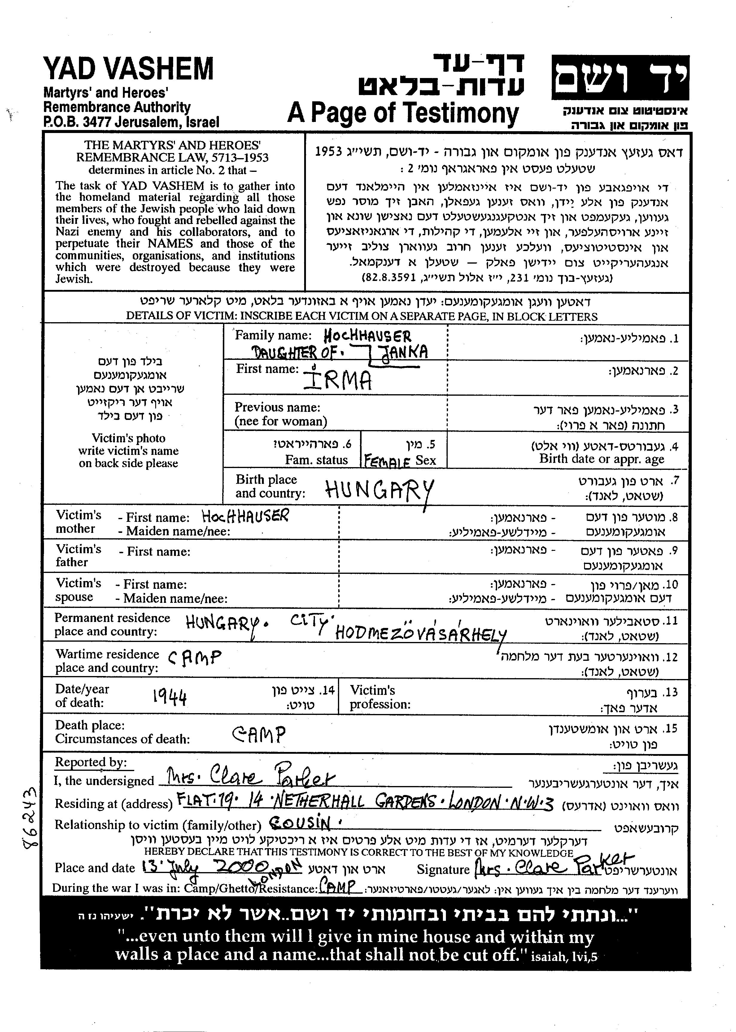 Hochhauser Irma Hodmezovasarhely, Hongrie Feuille de témoignage