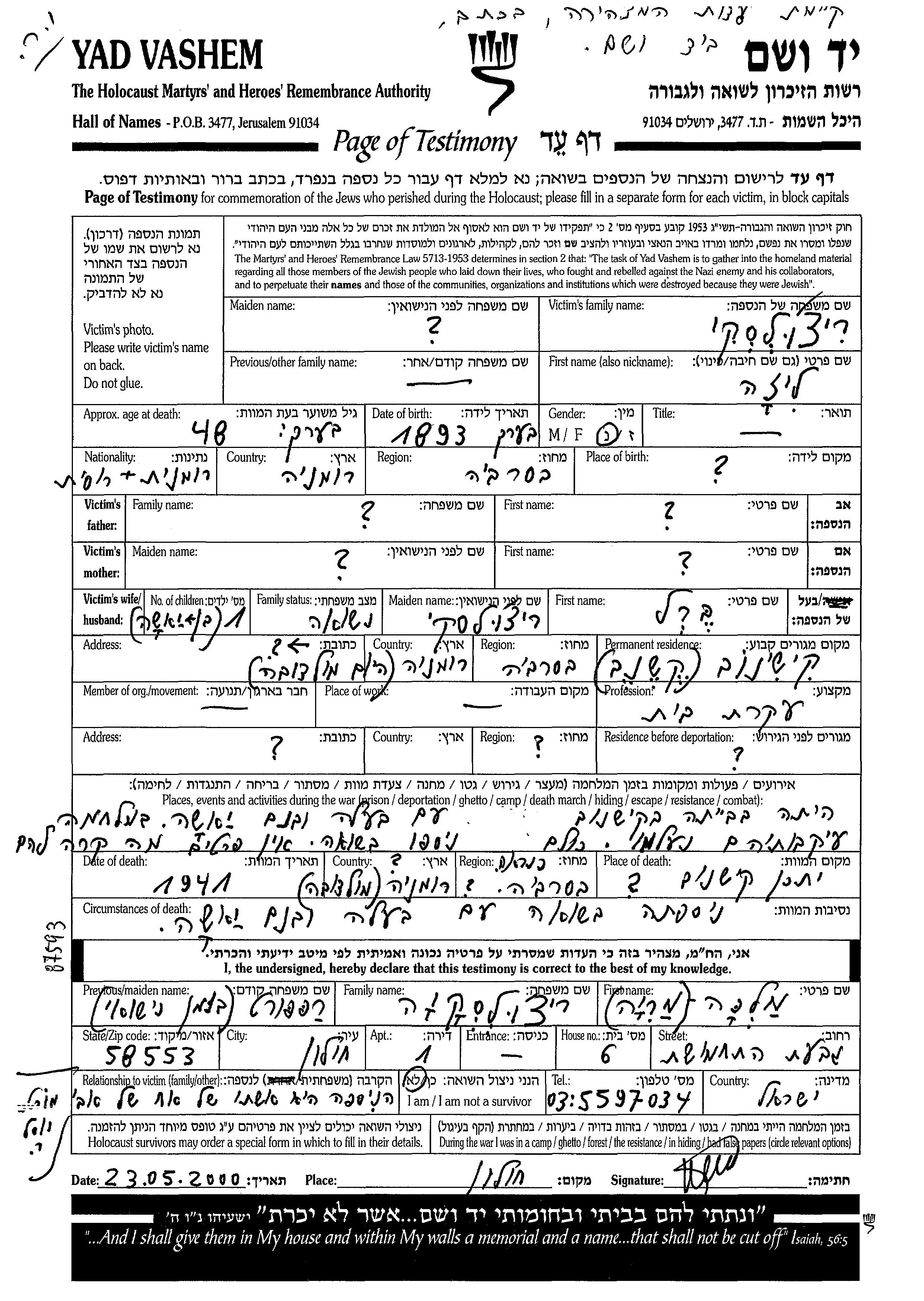 Yad Vashem - Pages of Testimony Names Memorial Collection