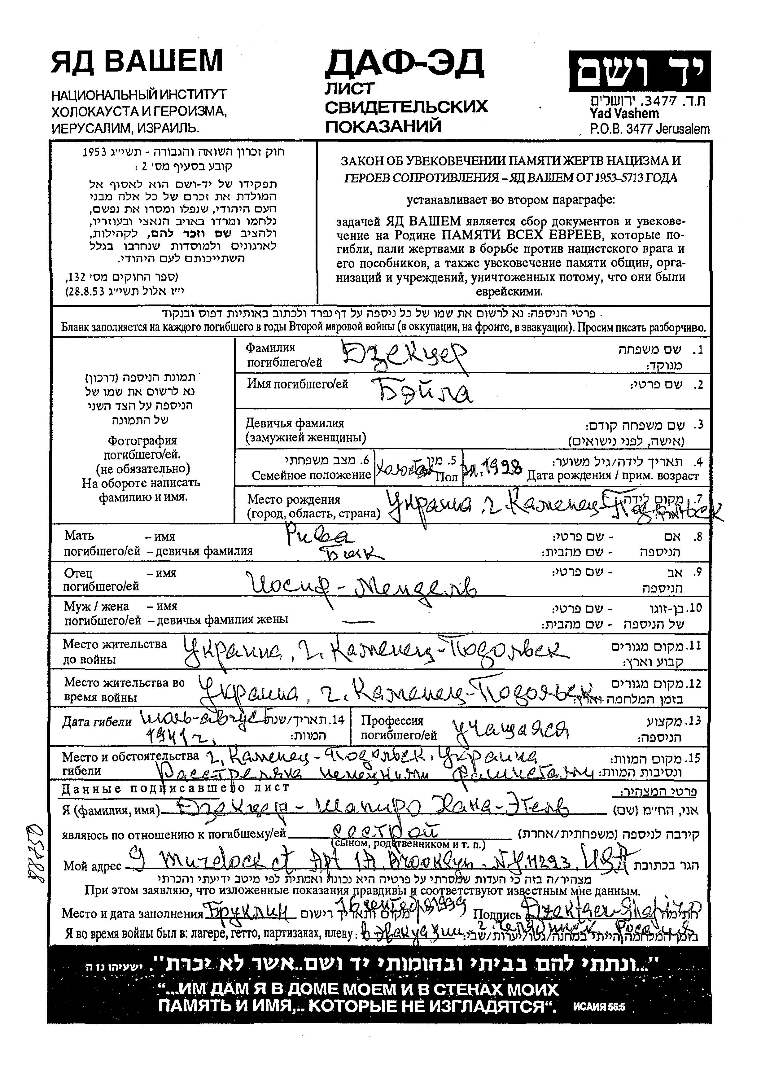 Dzektzer Beila 1928 Kamenets Podolskiy, Ukraine (URSS) Feuille de témoignage