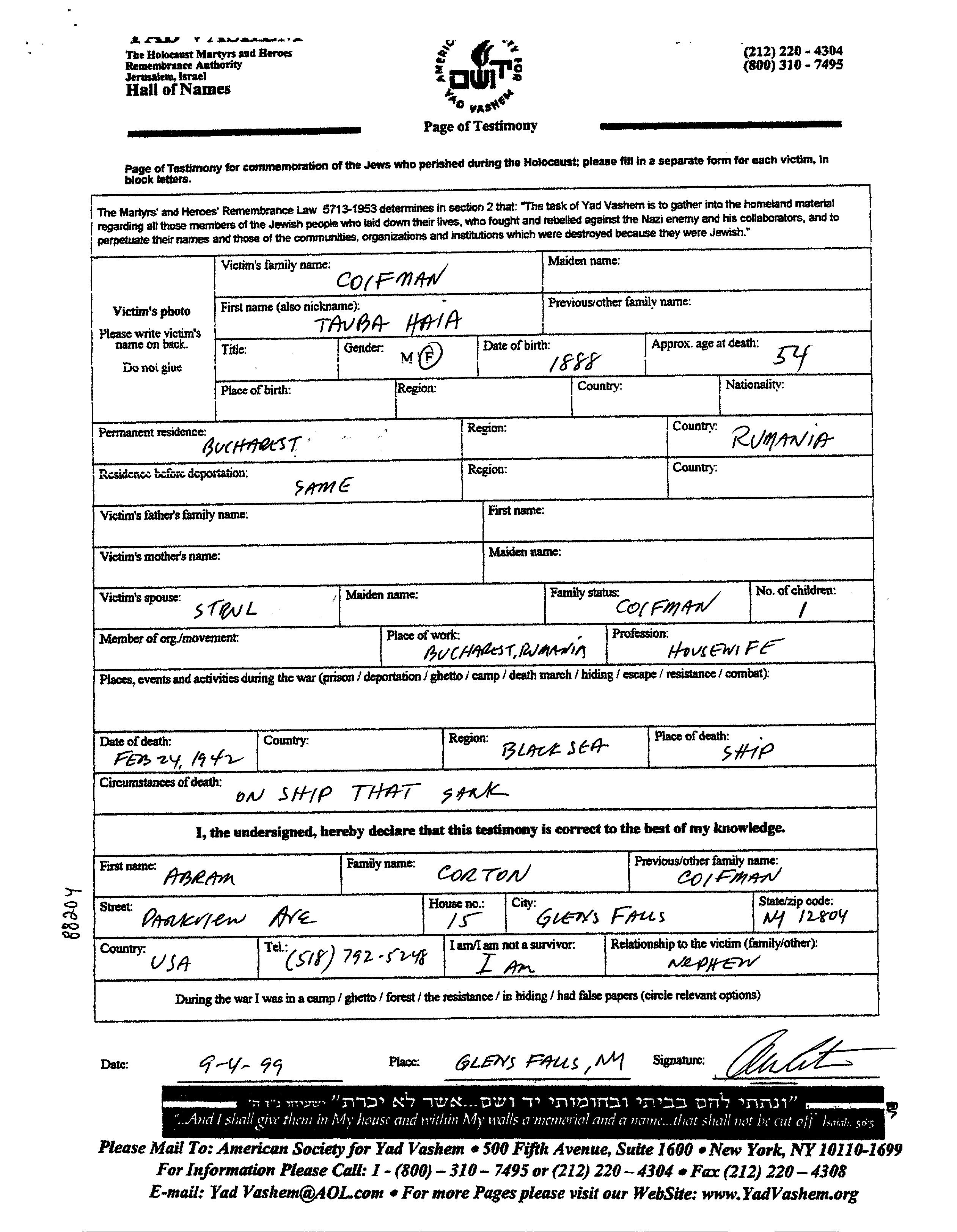 Coifman Tauba Haia 1888 Bucuresti, Roumanie Feuille de témoignage