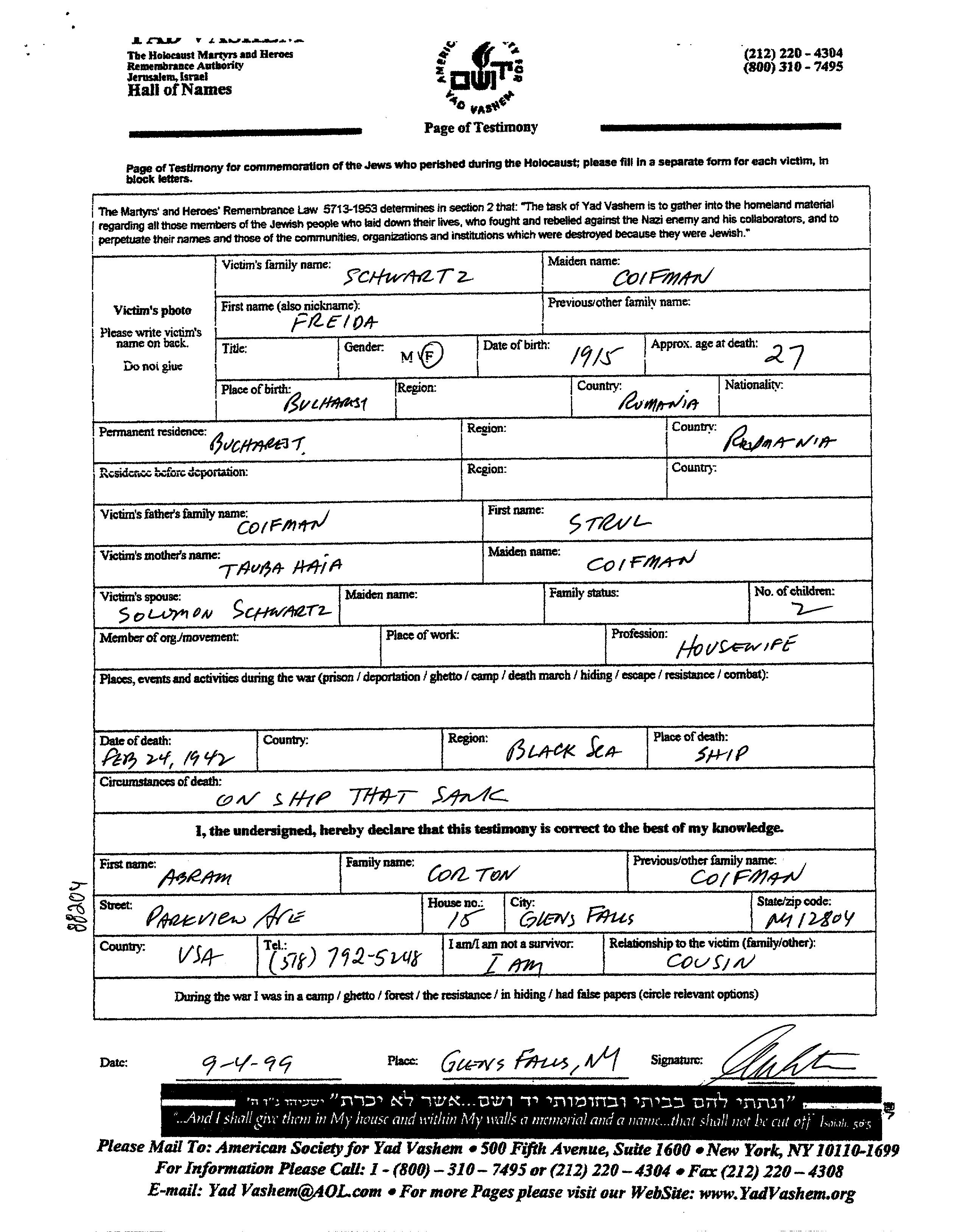 Schwartz Freida 1915 Bucarest, Roumanie Feuille de témoignage