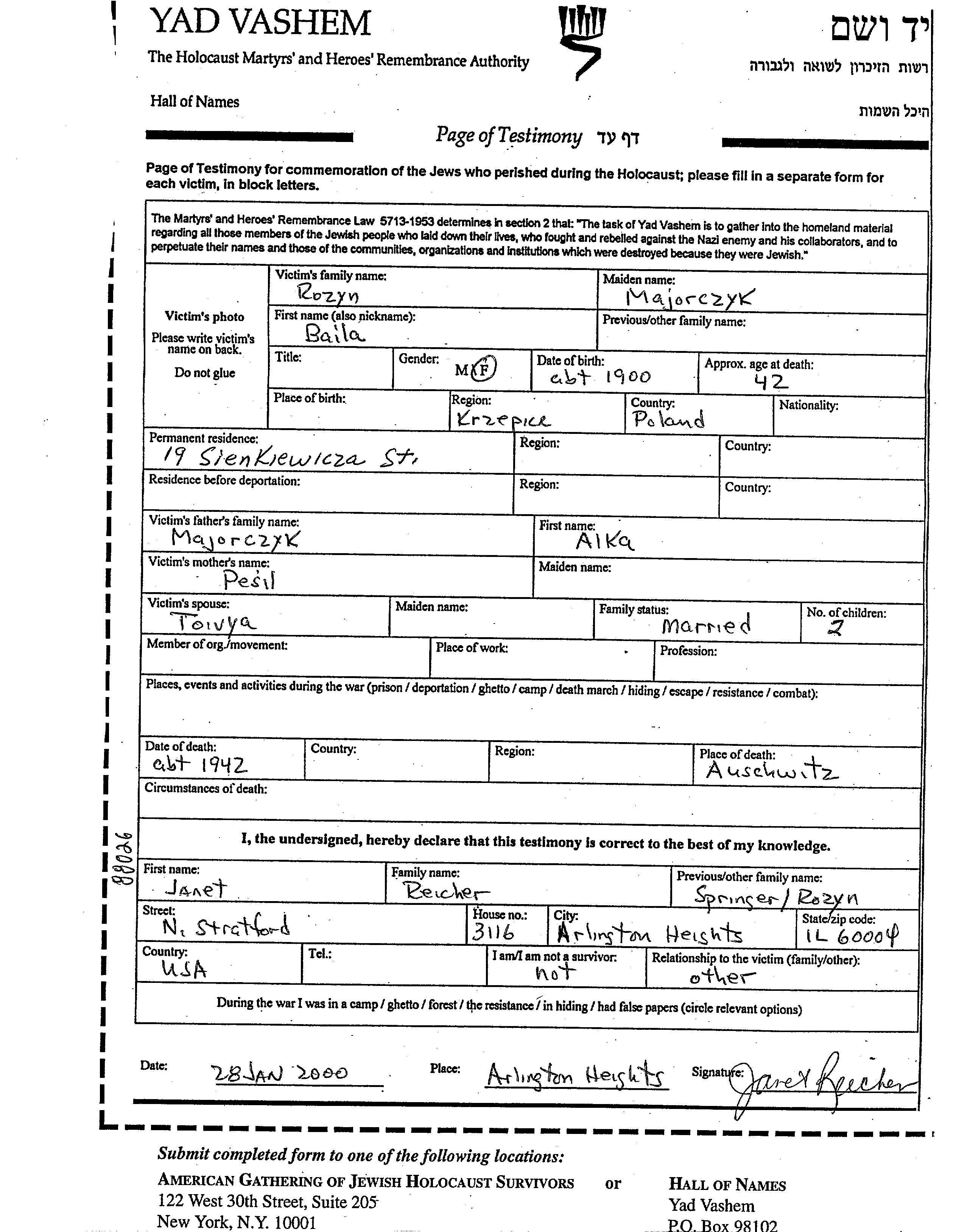 Baila Rozyn née Majorczyk est née à Krzepice, Pologne en 1900, fille de Alka et de Pesil. Avant la seconde guerre mondiale elle vivait à Krzepice, Pologne.