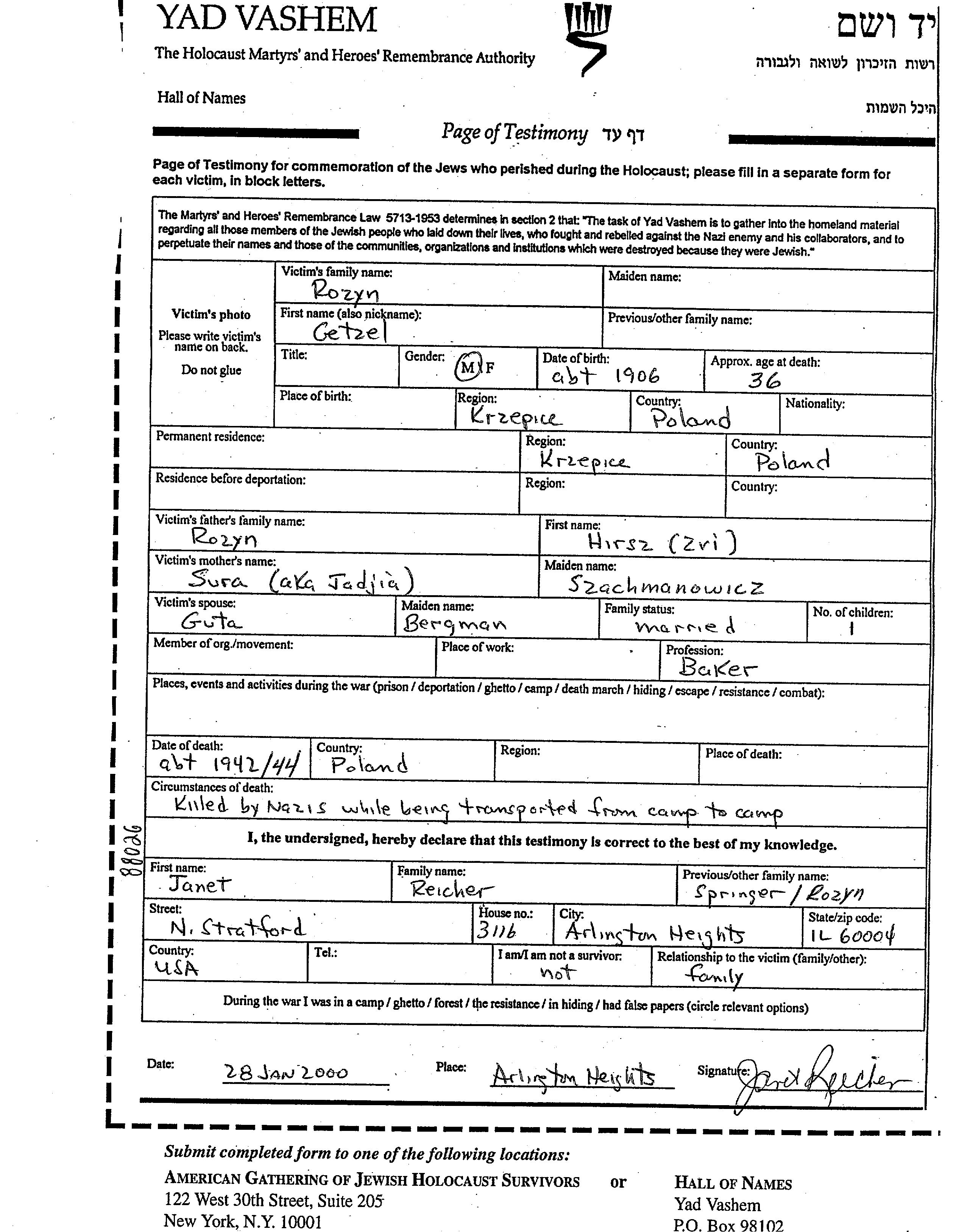 Rozyn Getzel 1906 Krzepice, Pologne Feuille de témoignage