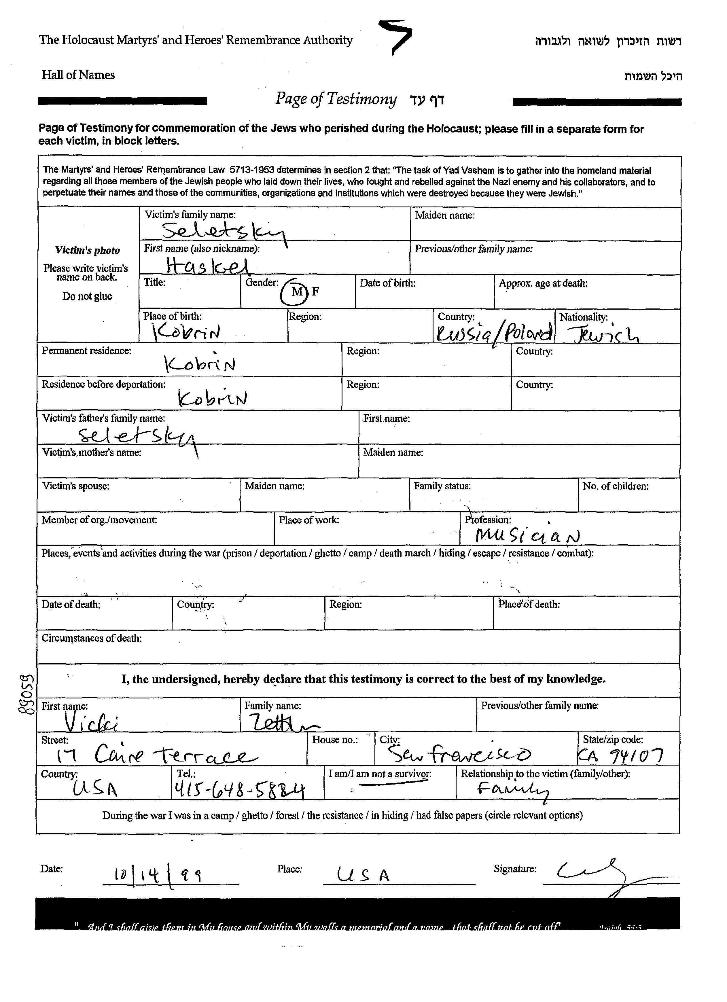 Seletsky Haskel Kobrin, Pologne Feuille de témoignage