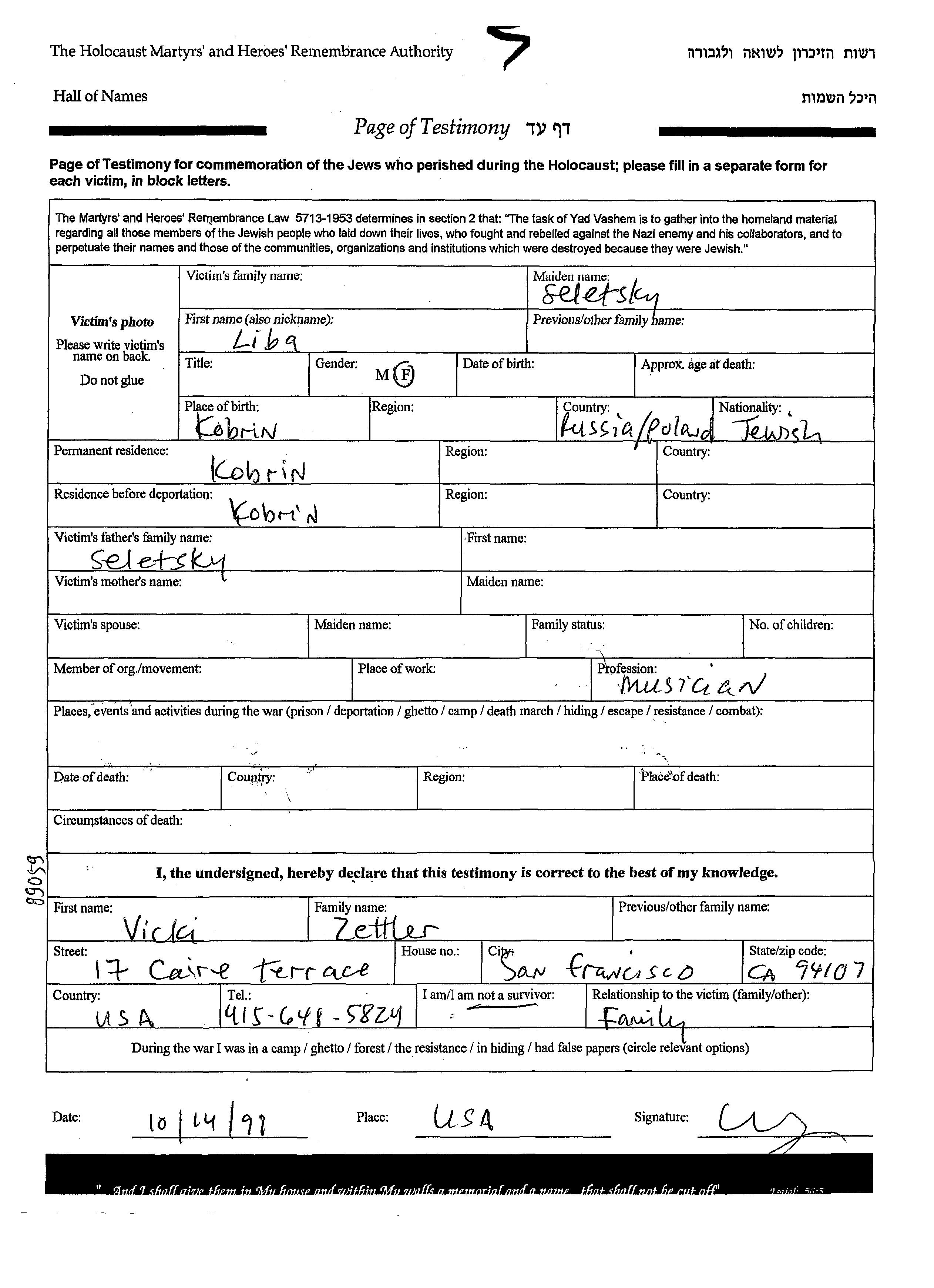 Yad Vashem - Pages of Testimony Names Memorial Collection