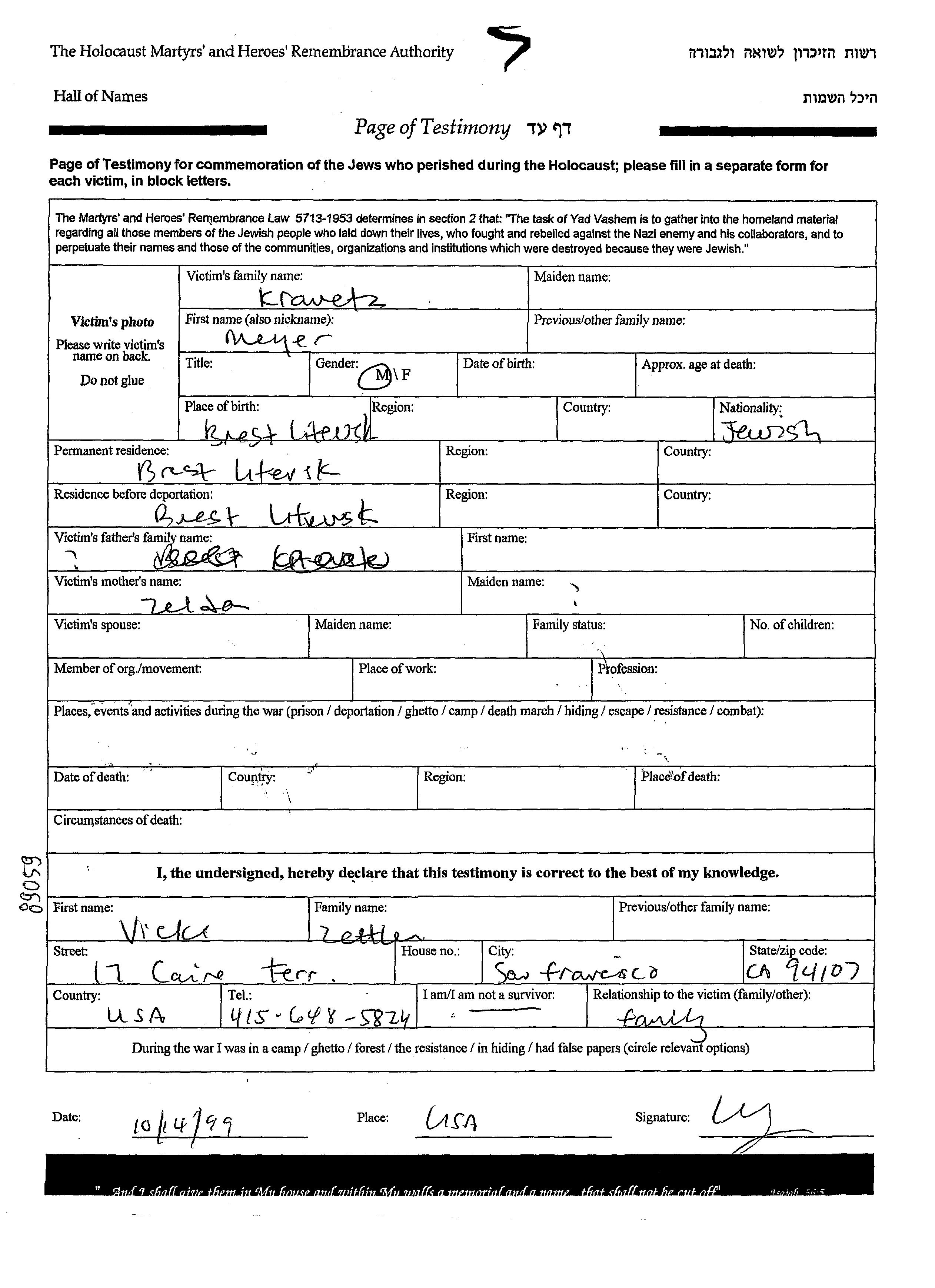 Lieu de résidence pendant la guerre/Shoah