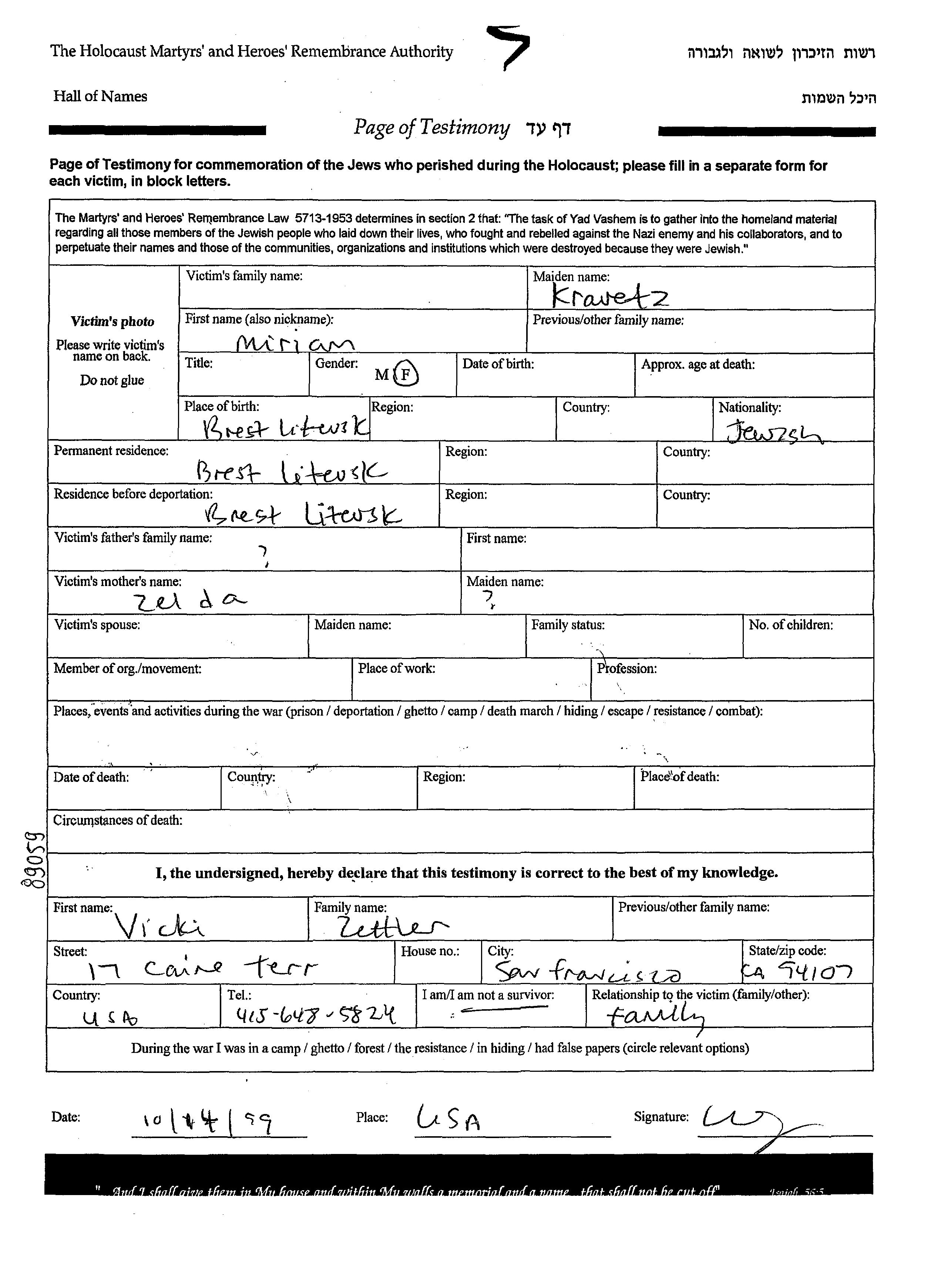 Miriam nom inconnu née Kravitz est née à Brześć nad Bugiem, Pologne, fille de Zelda. Avant la seconde guerre mondiale elle vivait à Brześć nad Bugiem, Pologne. Pendant la guerre, elle était à Brześć nad Bugiem, Pologne.