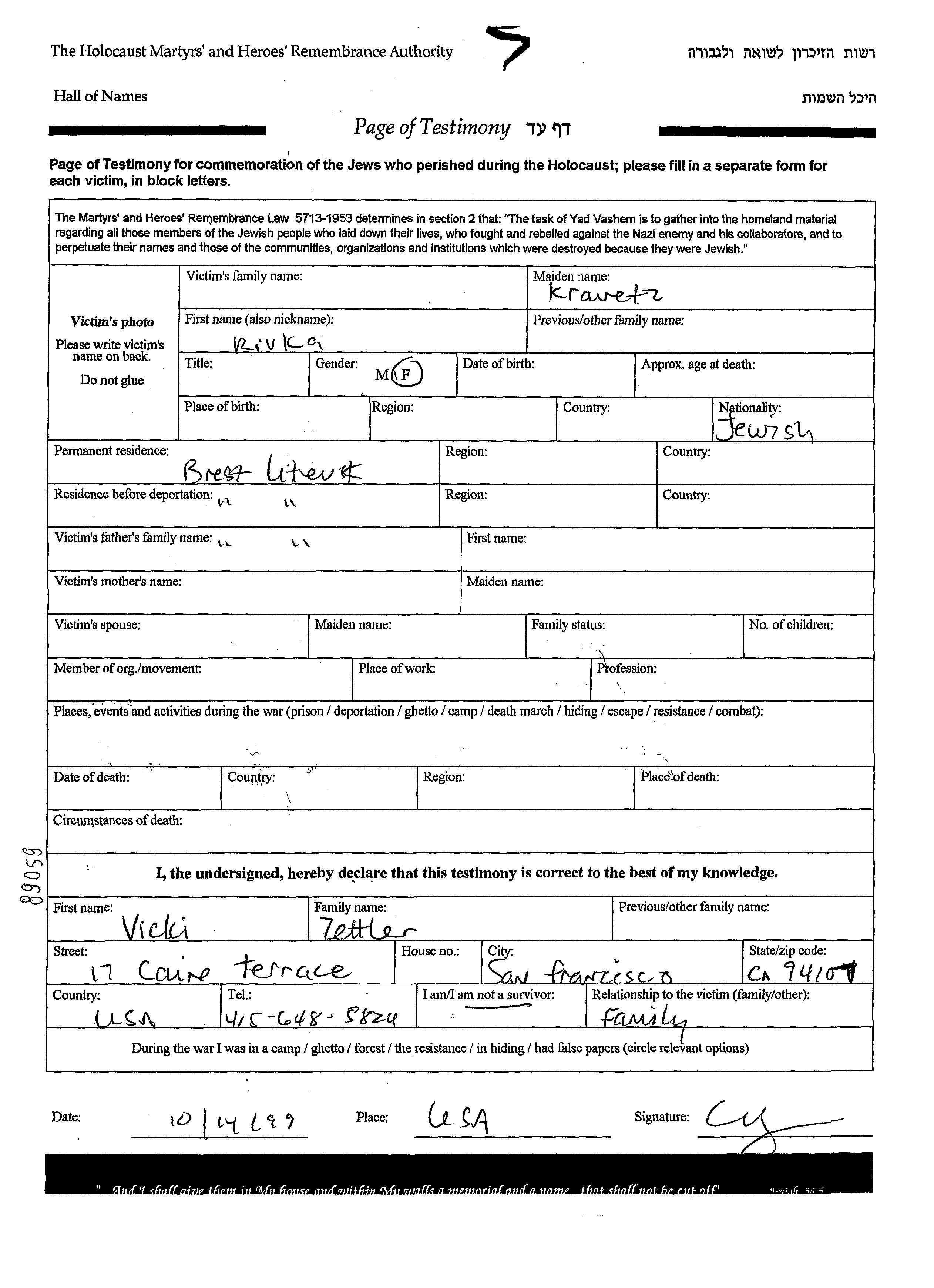 Lieu de résidence pendant la guerre/Shoah