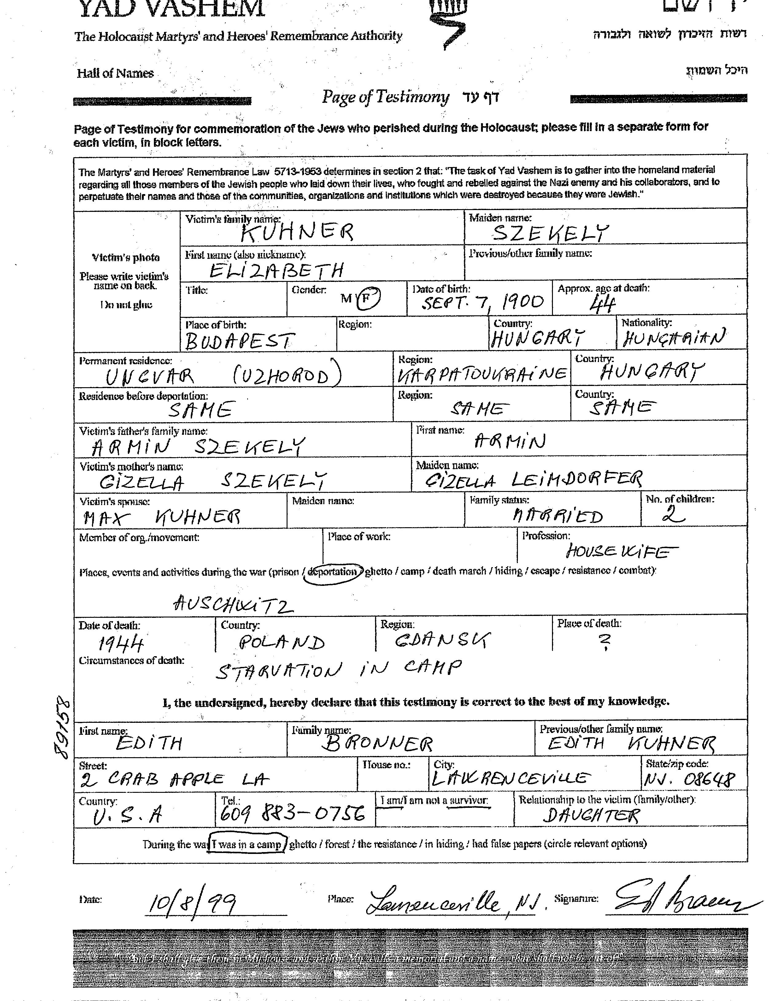 Kuhner Elizabeth 1900 Ungvar, Tchécoslovaquie Feuille de témoignage