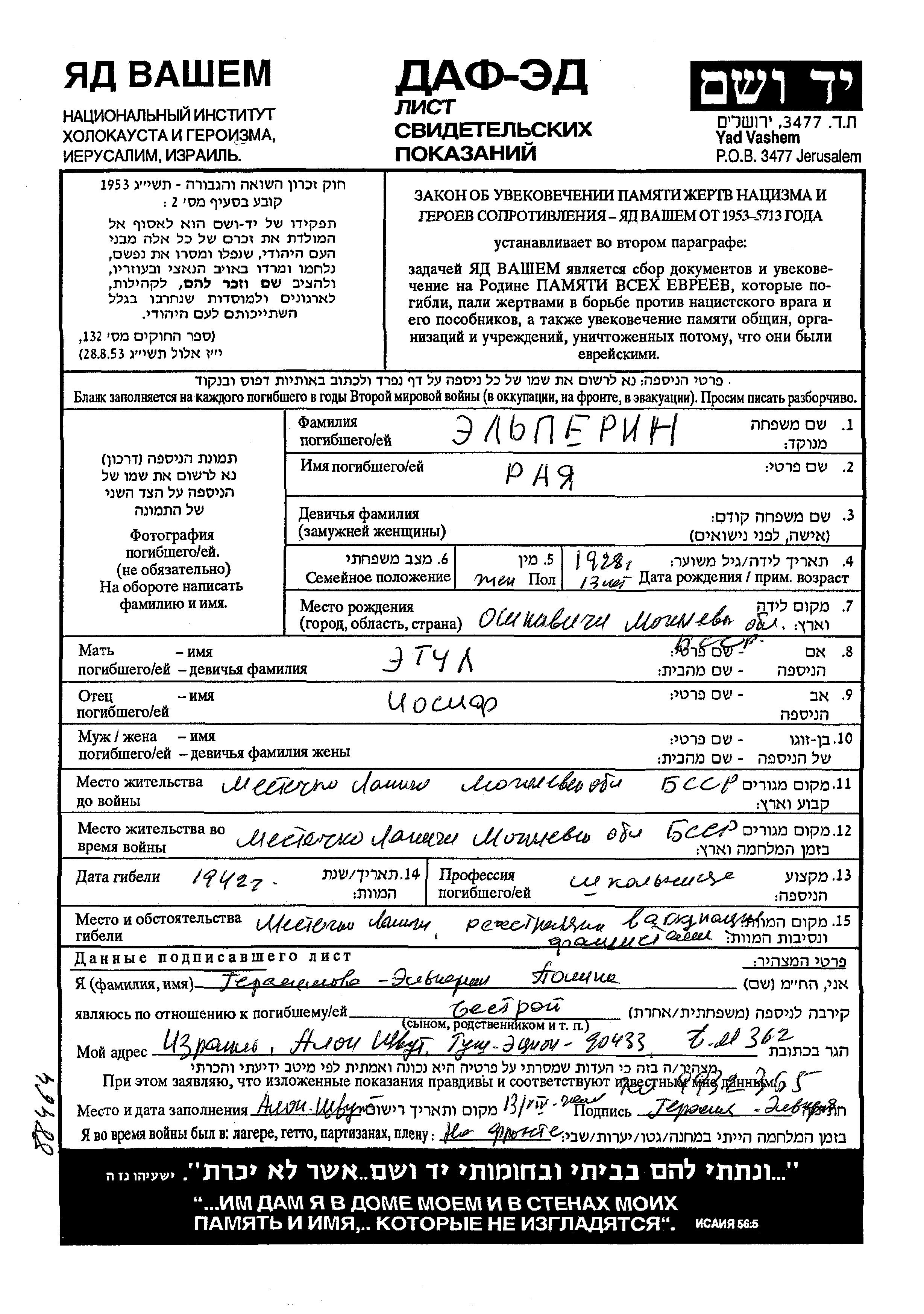 Yad Vashem - Pages of Testimony Names Memorial Collection