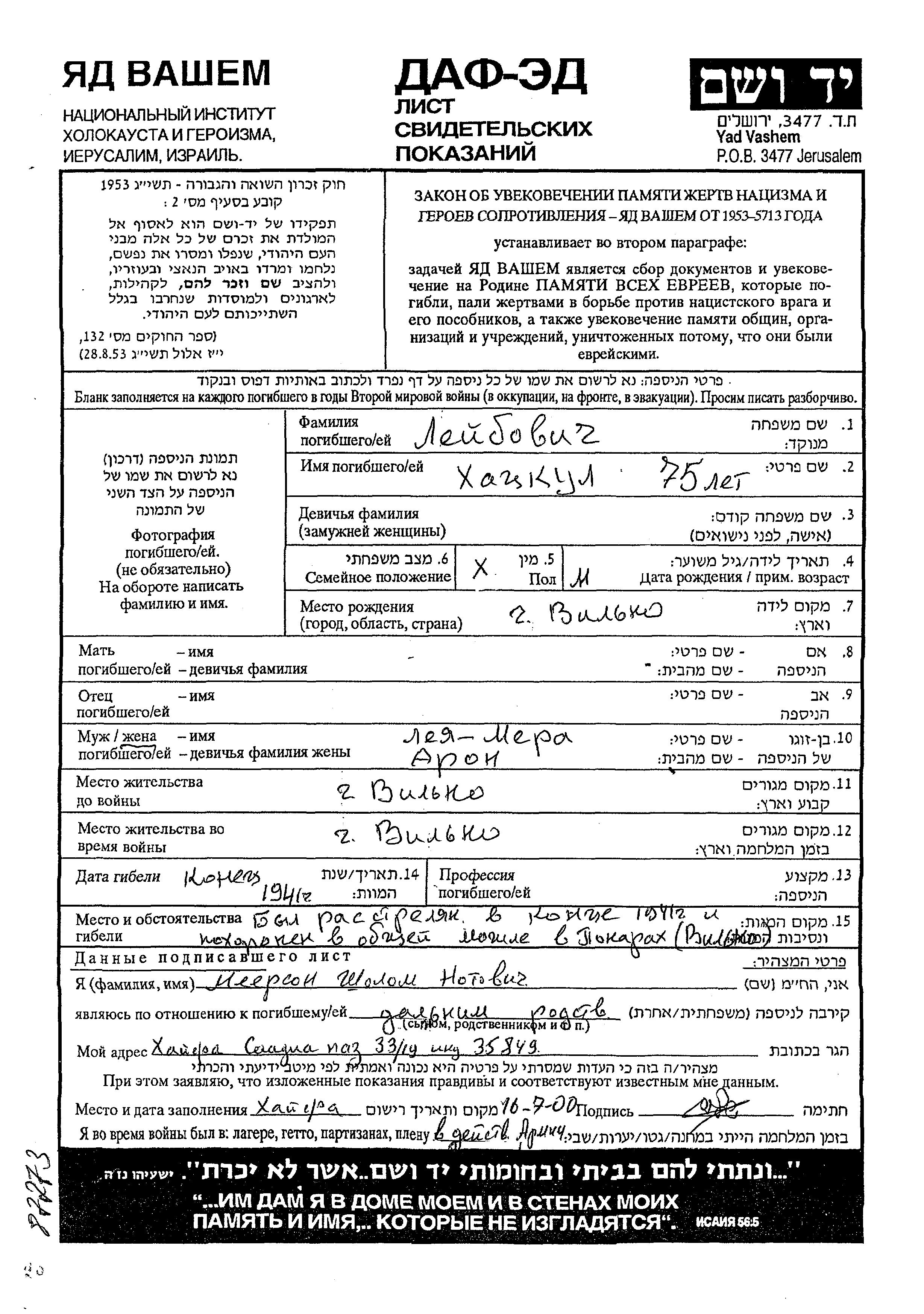 Leibovich Khatzkul Wilno, Pologne Feuille de témoignage
