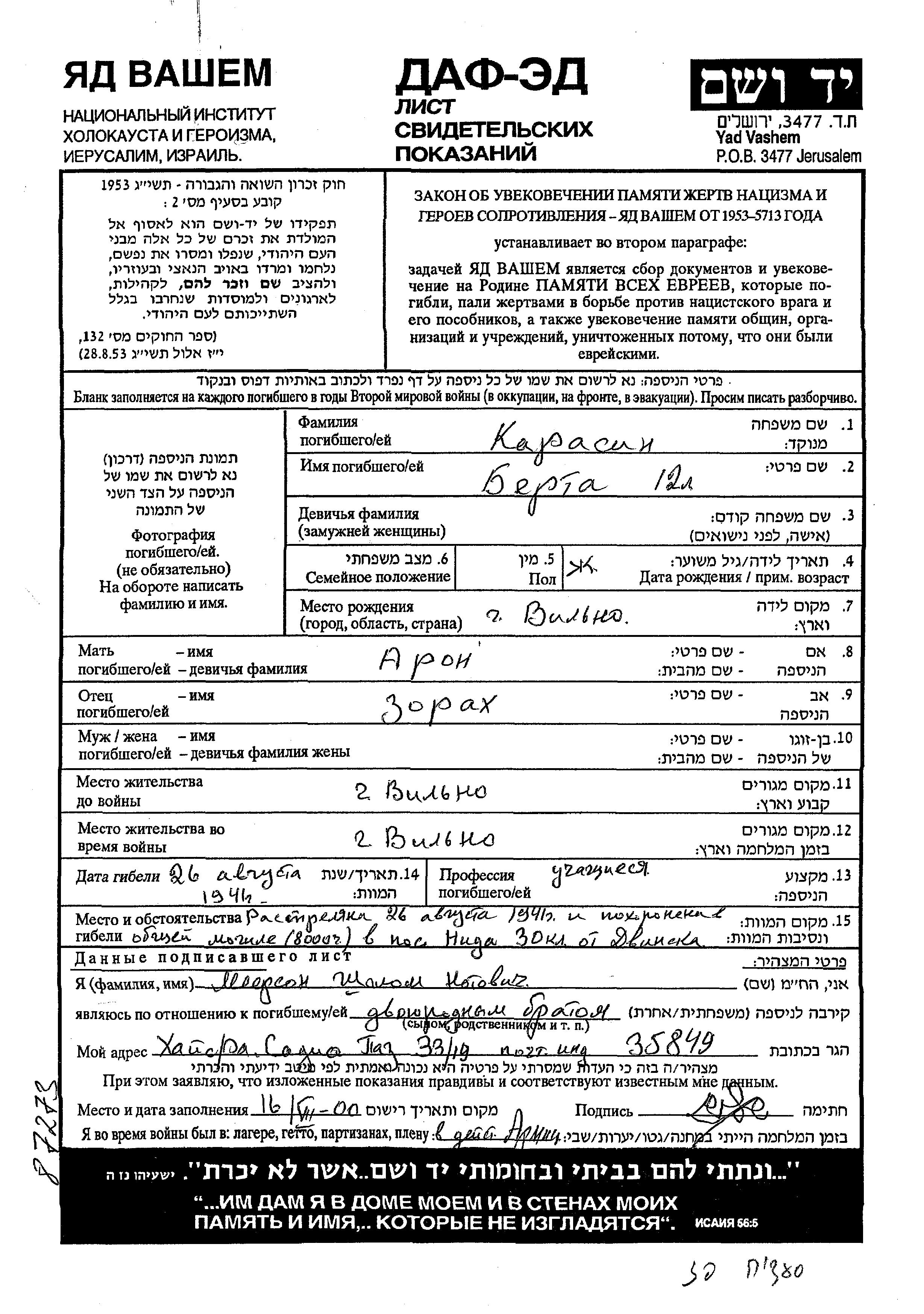 Karasin Berta Wilno, Pologne Feuille de témoignage