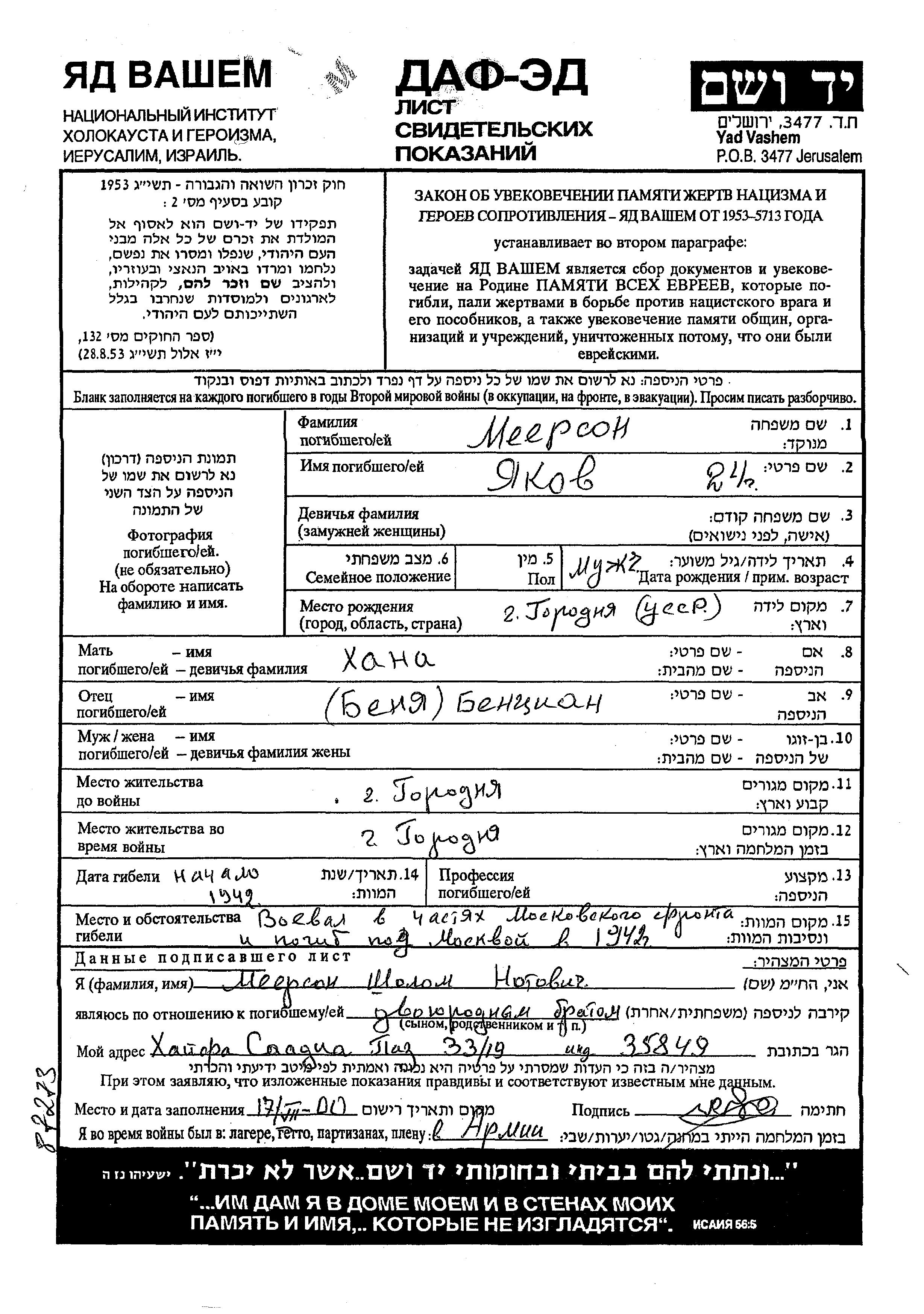 Meerson Yakov Gorodnya, Ukraine (URSS) Feuille de témoignage