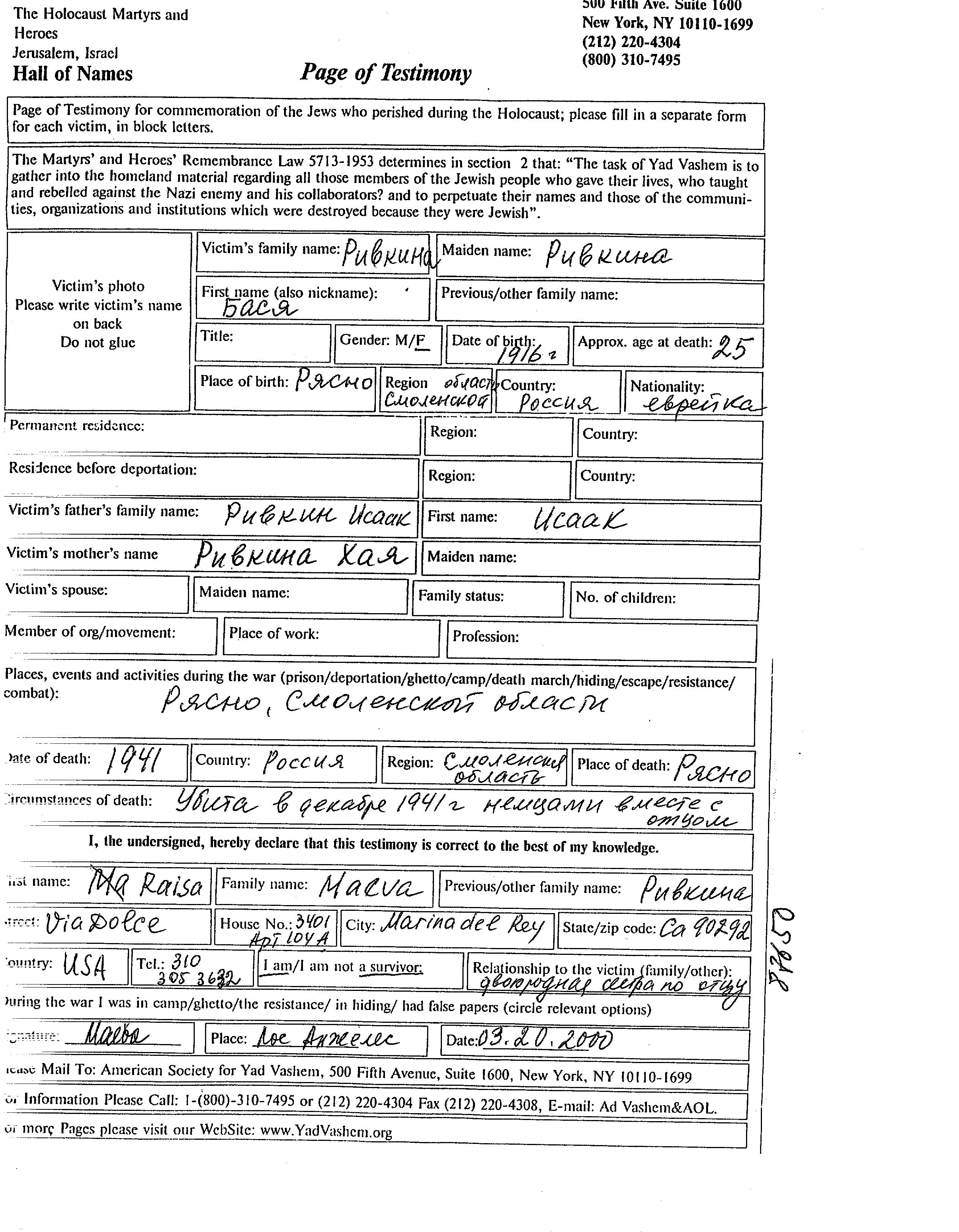 Rivkina Basya 1916 Ryasno, Bélorussie (URSS) Feuille de témoignage