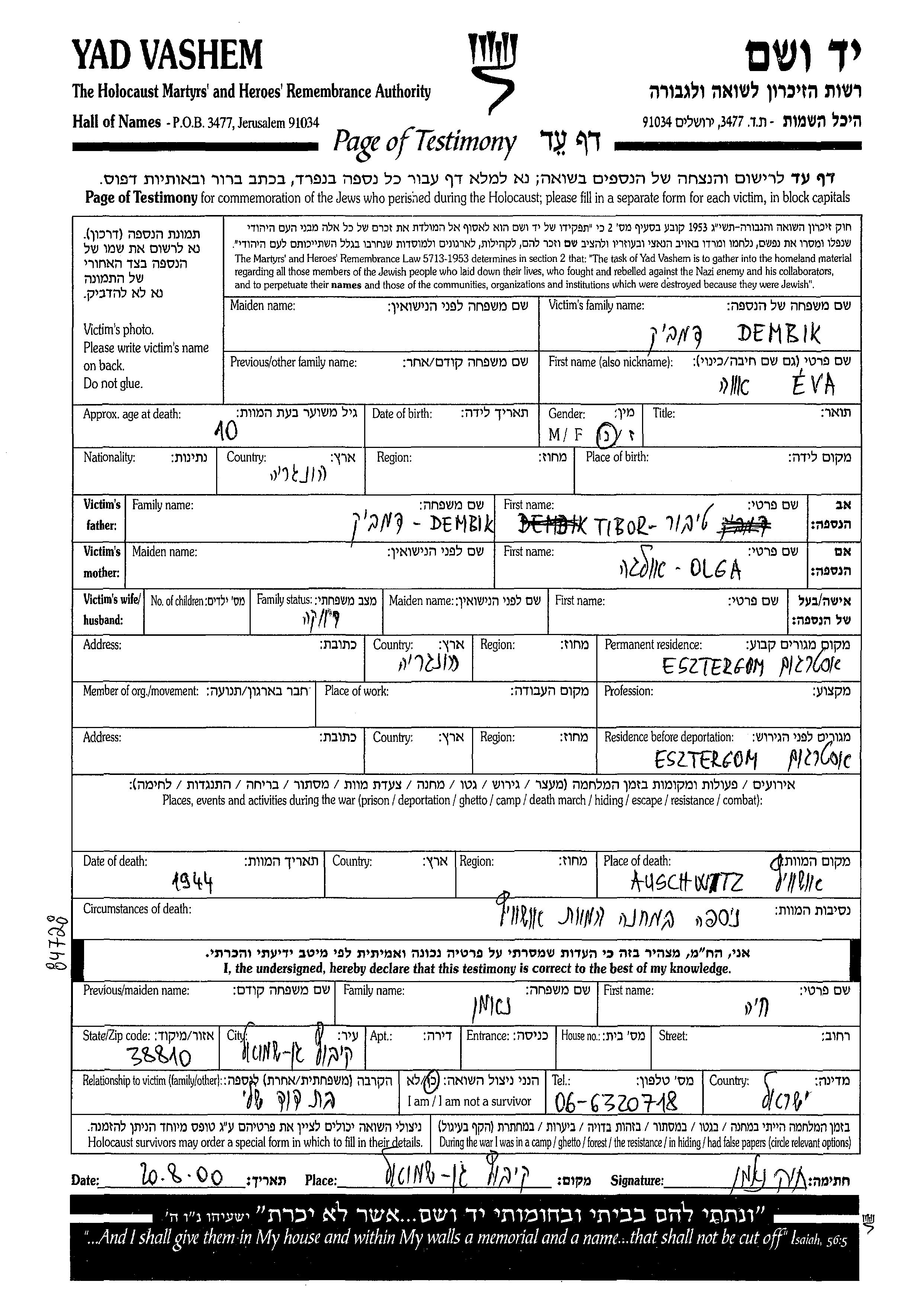 Dembik Eva Esztergom, Hongrie Feuille de témoignage