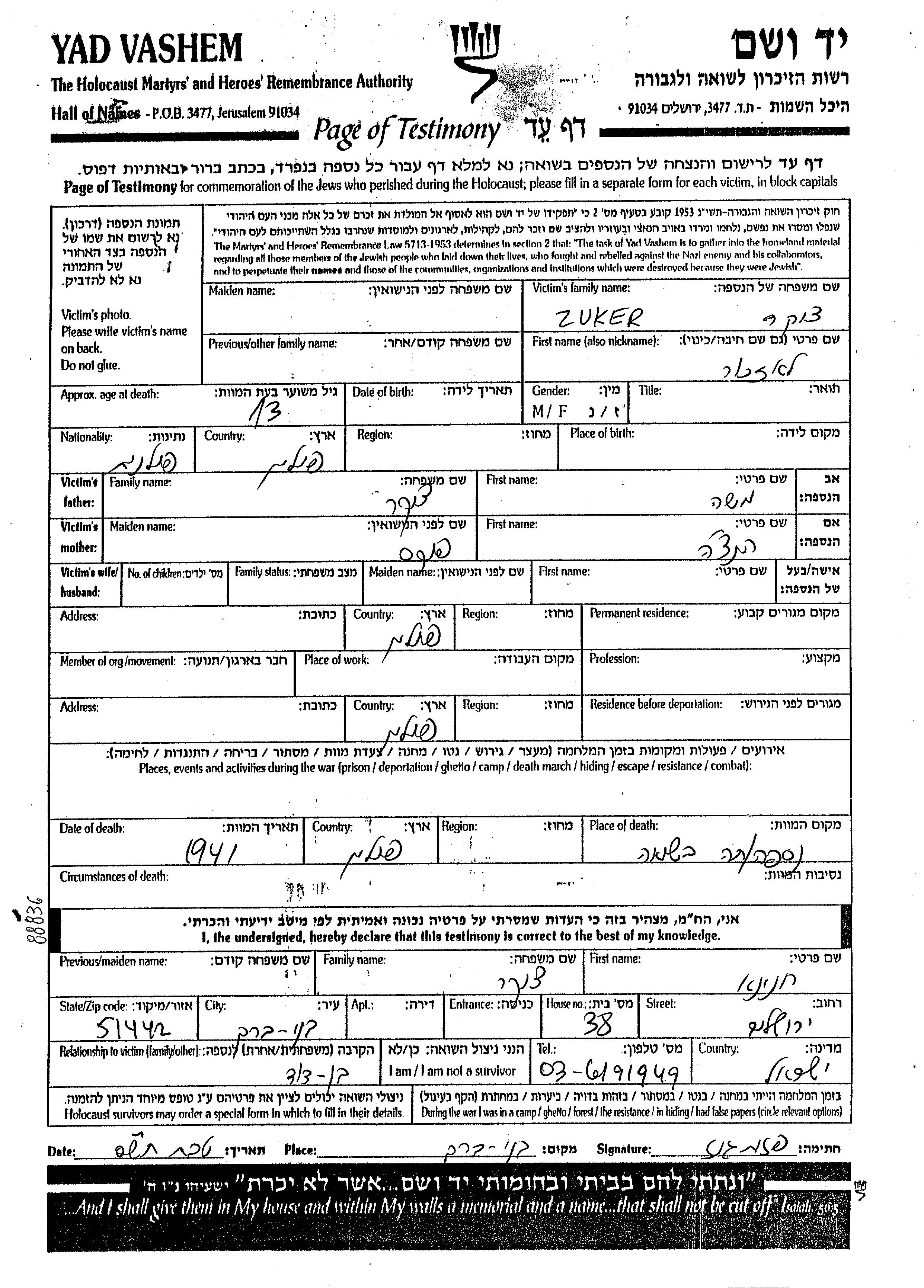 Zuker prénom inconnu Pologne Feuille de témoignage
