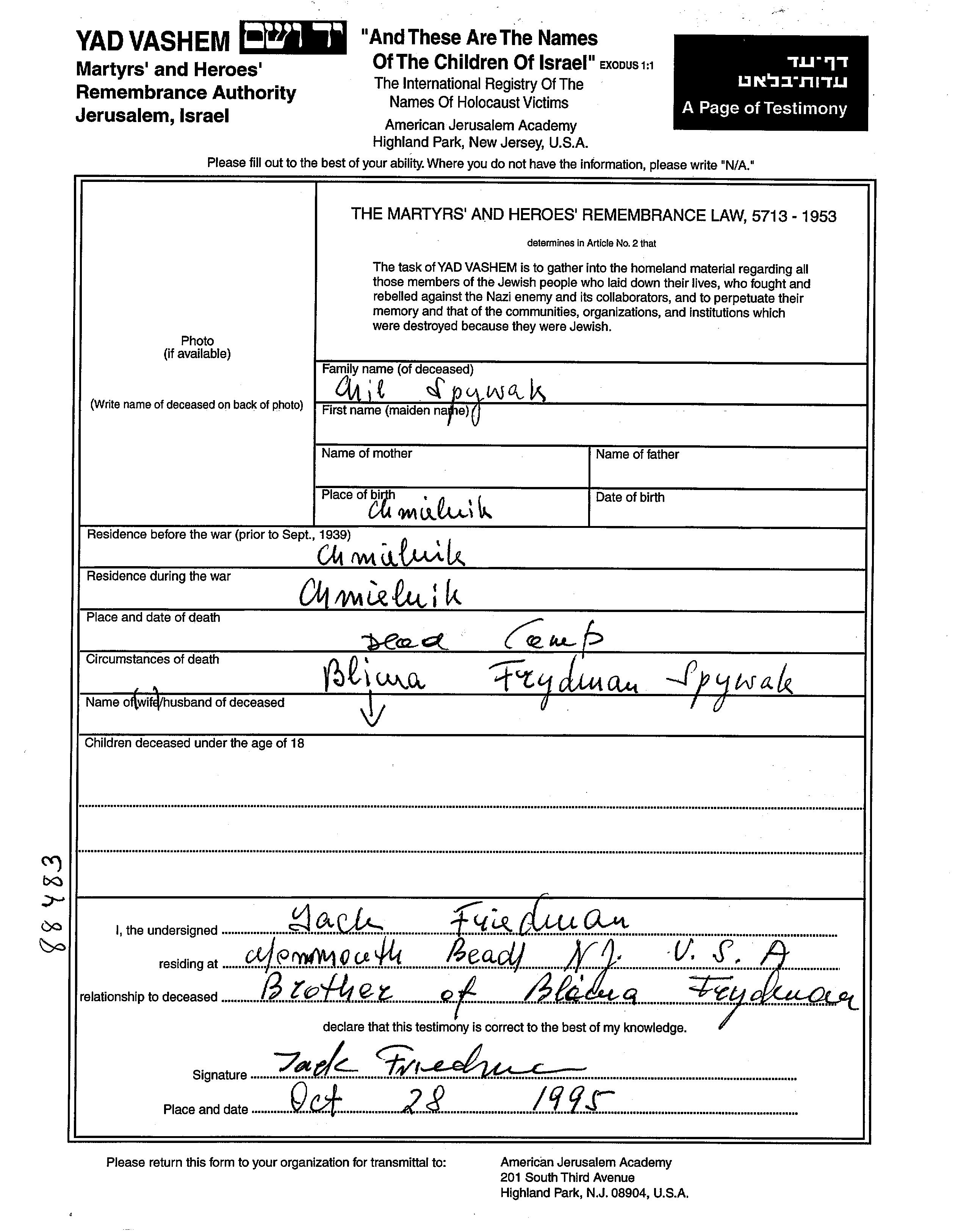 Chil Spywak est né à Chmielnik, Pologne. Il était Mariée à Blima née Frydman. Avant la seconde guerre mondiale il vivait à Chmielnik, Pologne. Au cours de la guerre, il était à Chmielnik, Pologne.