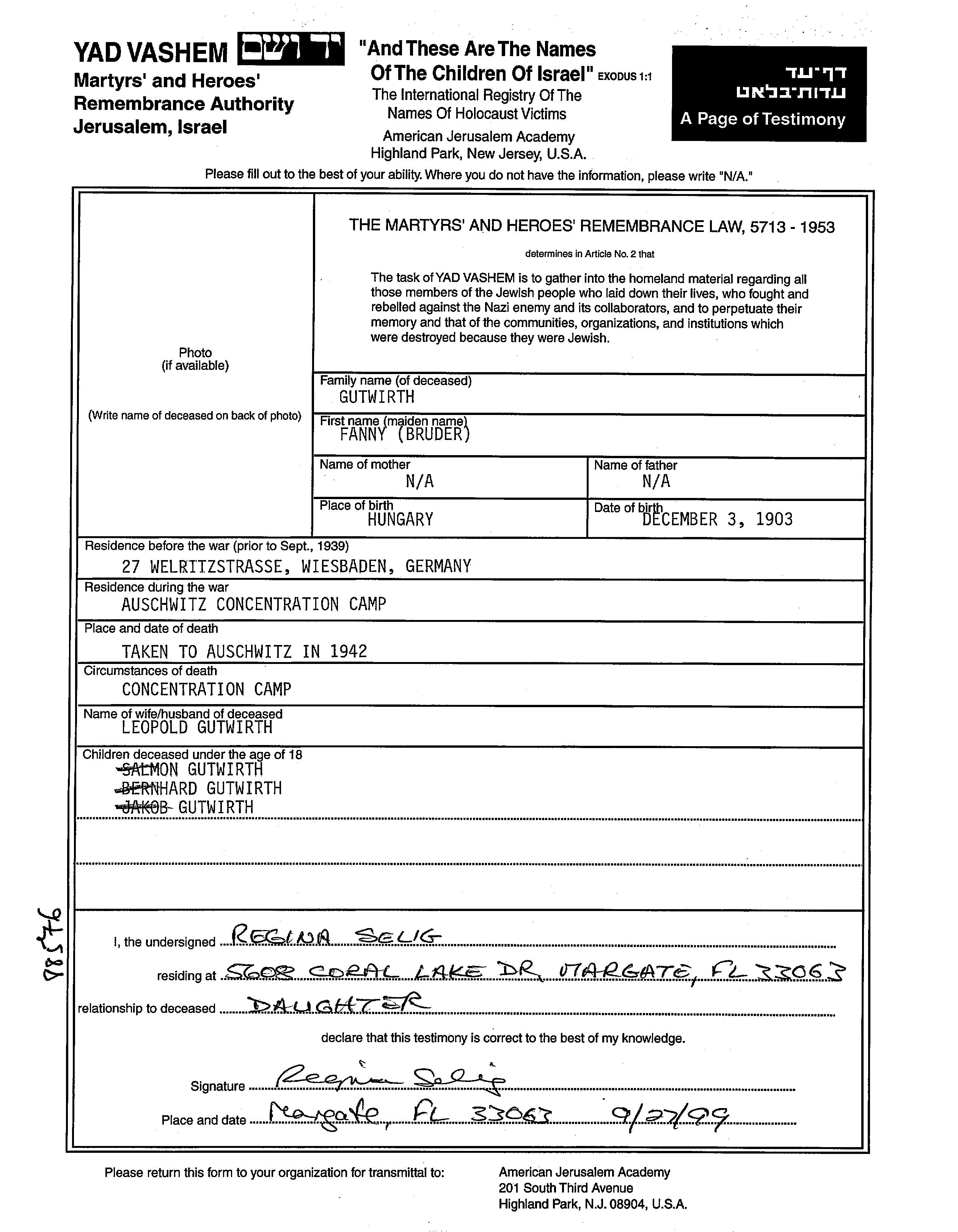 Gutwirth Fanny 1903 Wiesbaden, Allemagne Feuille de témoignage