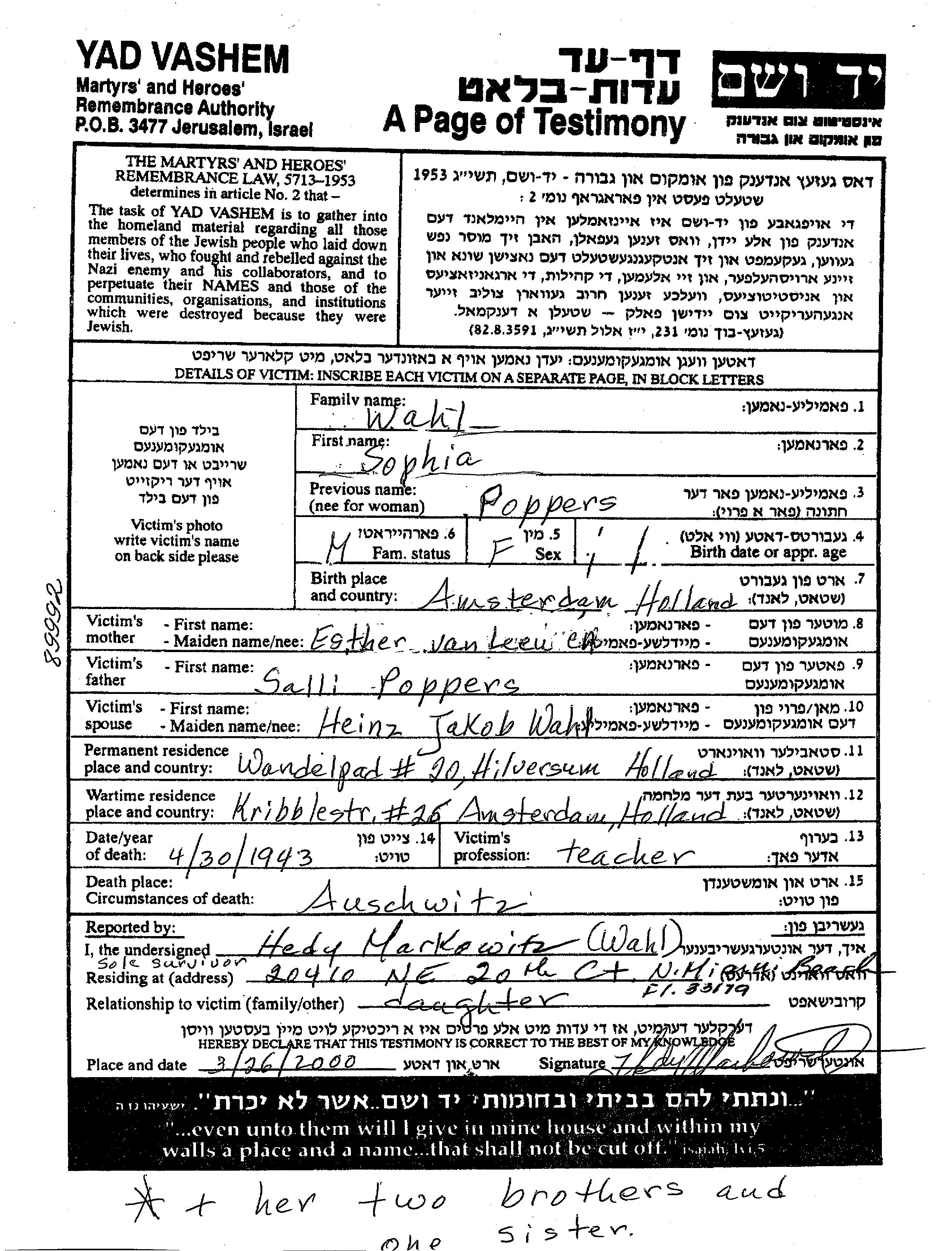Sophia Wahl née Poppers est née à Amsterdam, Pays-Bas, fille de Salli et de Esther. Elle était Mariée à Heinz Jakob. Avant la seconde guerre mondiale elle vivait à Hilversum, Pays-Bas. Pendant la guerre, elle était à Amsterdam, Pays-Bas.