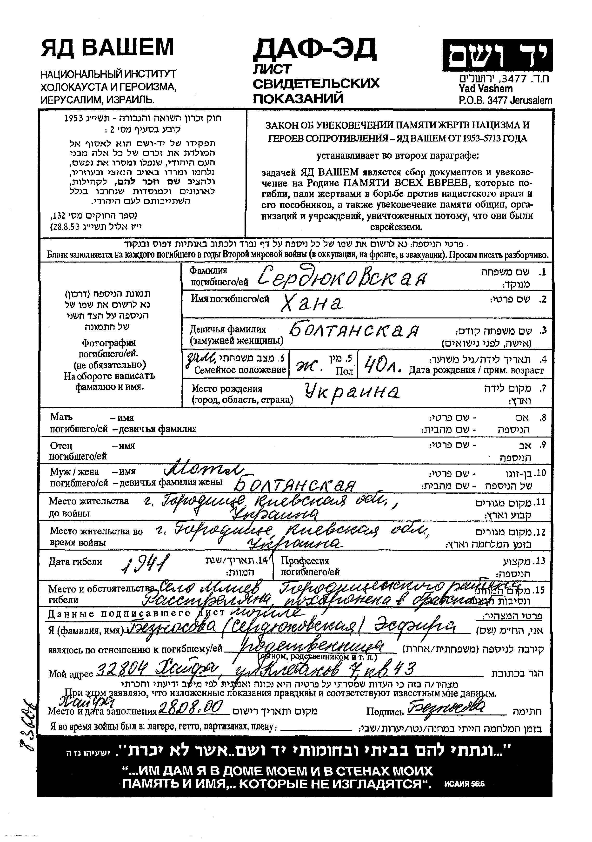 Hana Serdyukovskaya née Boltyanskaya est née à Ukraine (URSS). Elle était Mariée à Motl. Avant la seconde guerre mondiale elle vivait à Gorodishche, Ukraine (URSS). Pendant la guerre, elle était à Gorodishche, Ukraine (URSS).