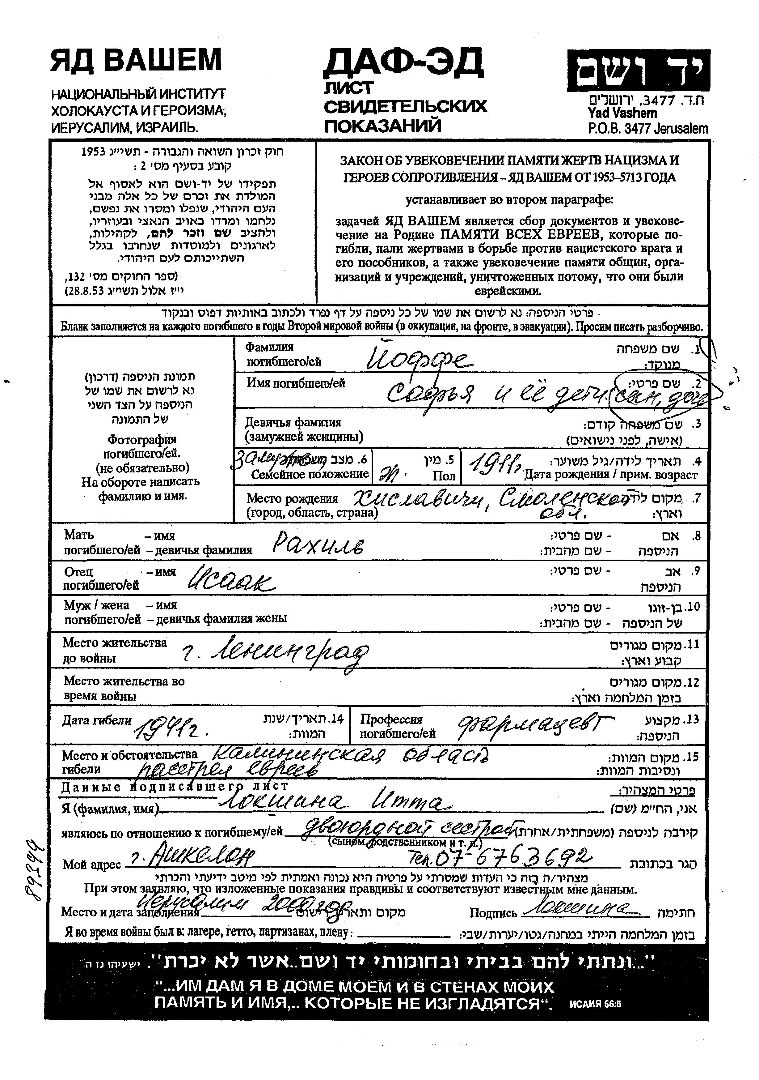 Yoffe Sofya 1911 Leningrad, Russie (URSS) Feuille de témoignage