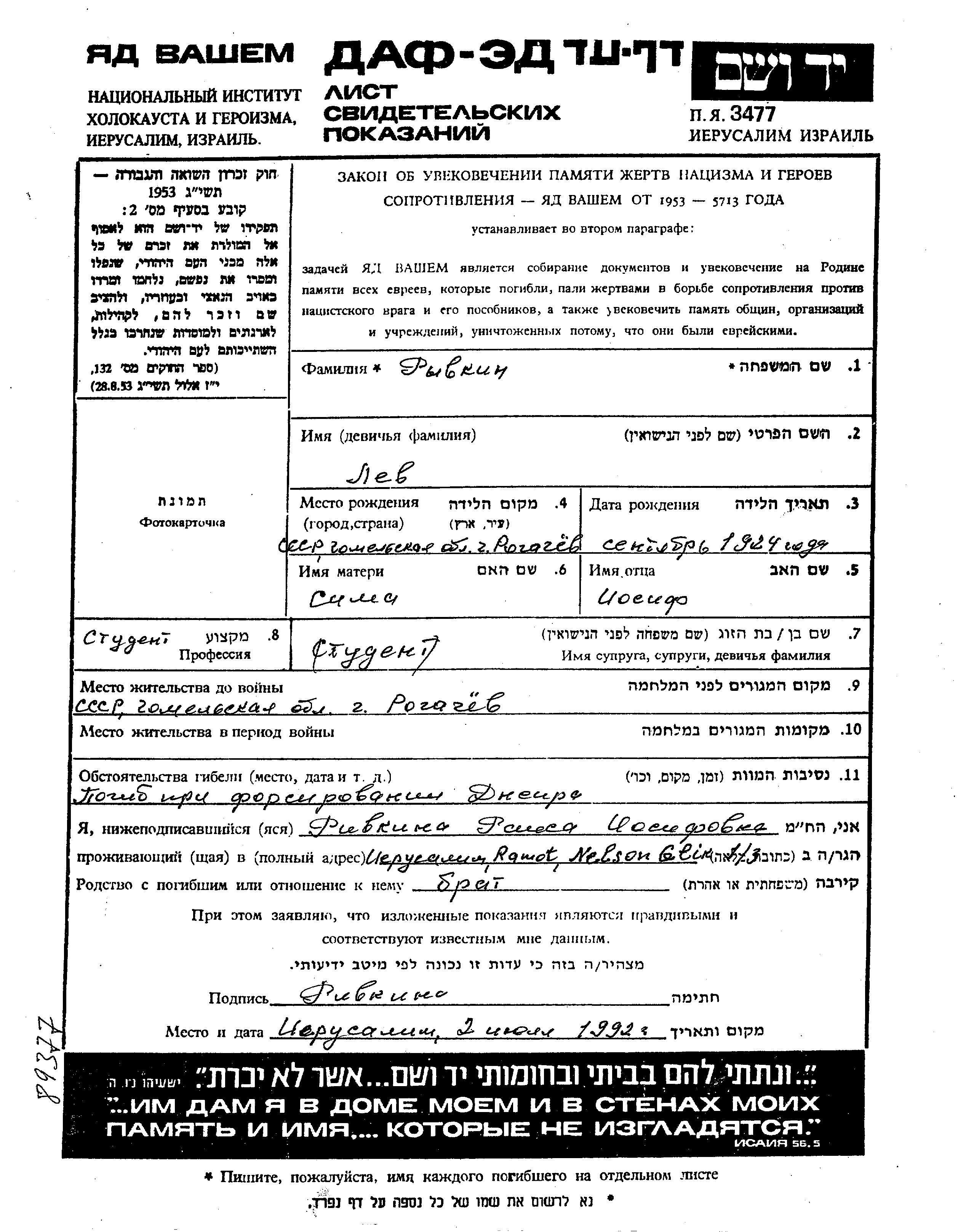 Lev Ryvkin est né à Rogachev, Bélorussie (URSS) en 1924, fils de Iosif et de Sima. Il était Étudiant/e. Avant la seconde guerre mondiale il vivait à Rogachev, Bélorussie (URSS). Au cours de la guerre, il était à the Soviet armed forces. Lev a été tué en tant que militaire pendant la Seconde Guerre mondiale. Lieu de la mort: Dnieper, Lieu de massacre.
