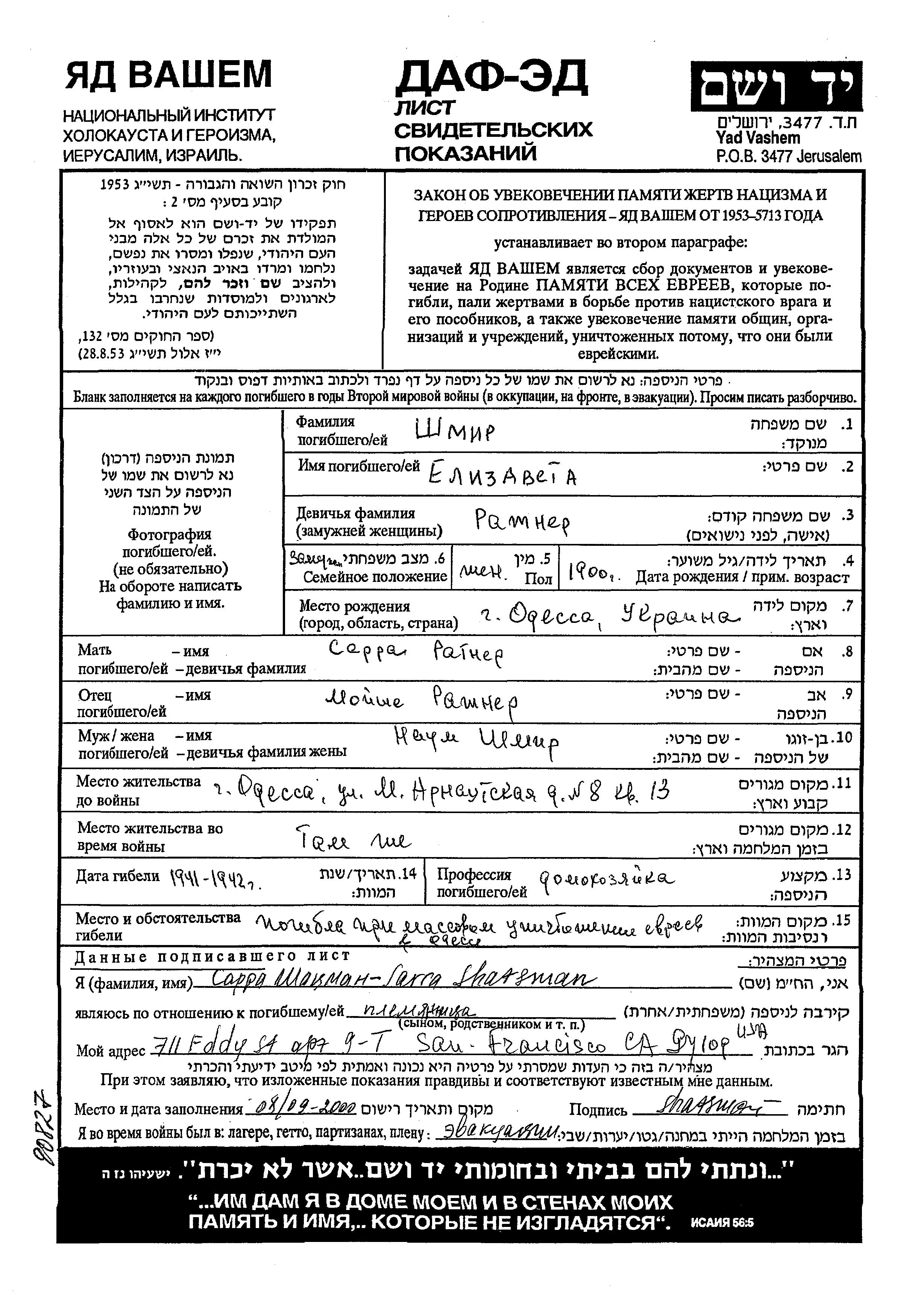 Shamir Yelizaveta 1900 Odessa, Ukraine (URSS) Feuille de témoignage