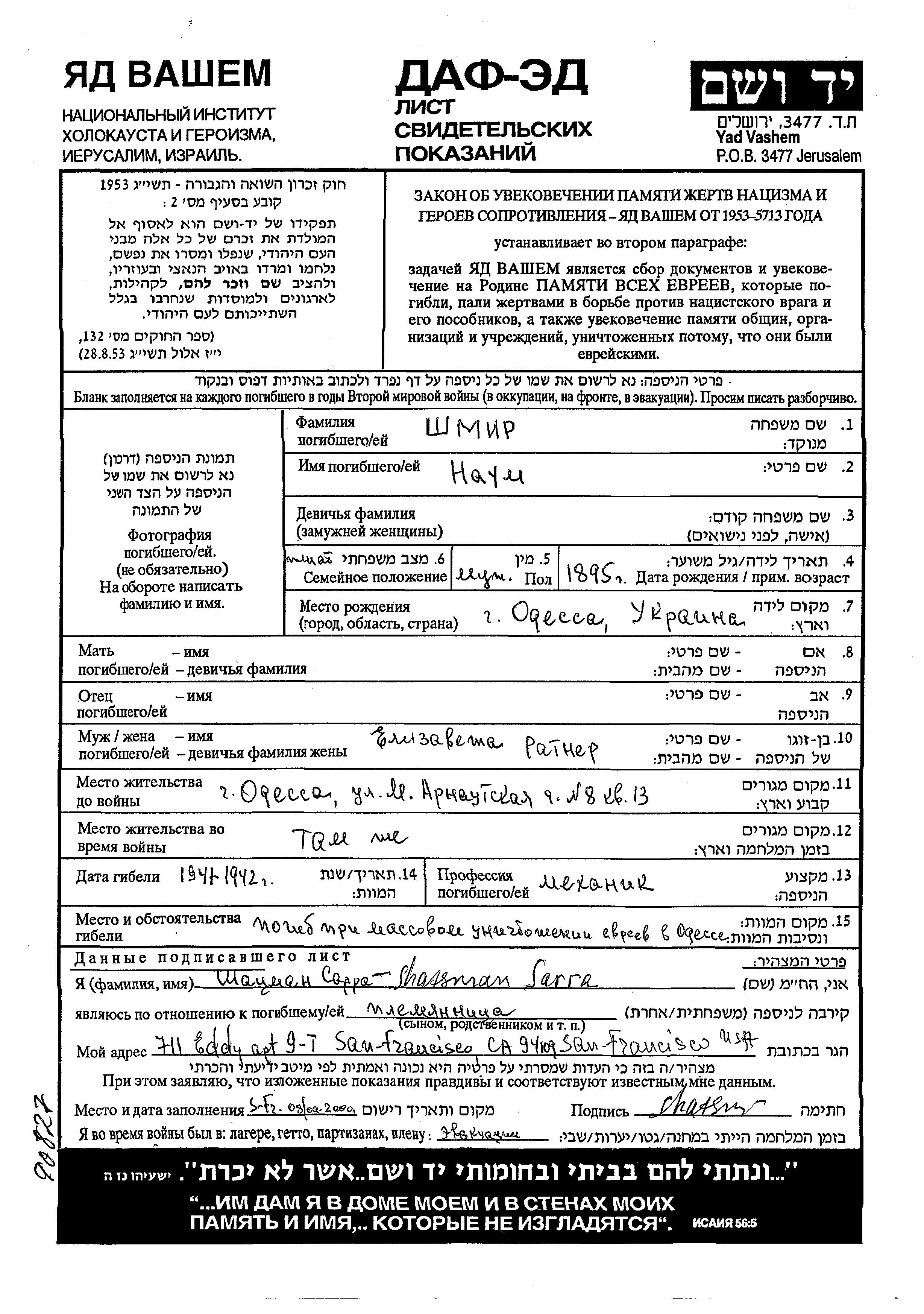 Shamir Nakhum 1895 Odessa, Ukraine (URSS) Feuille de témoignage