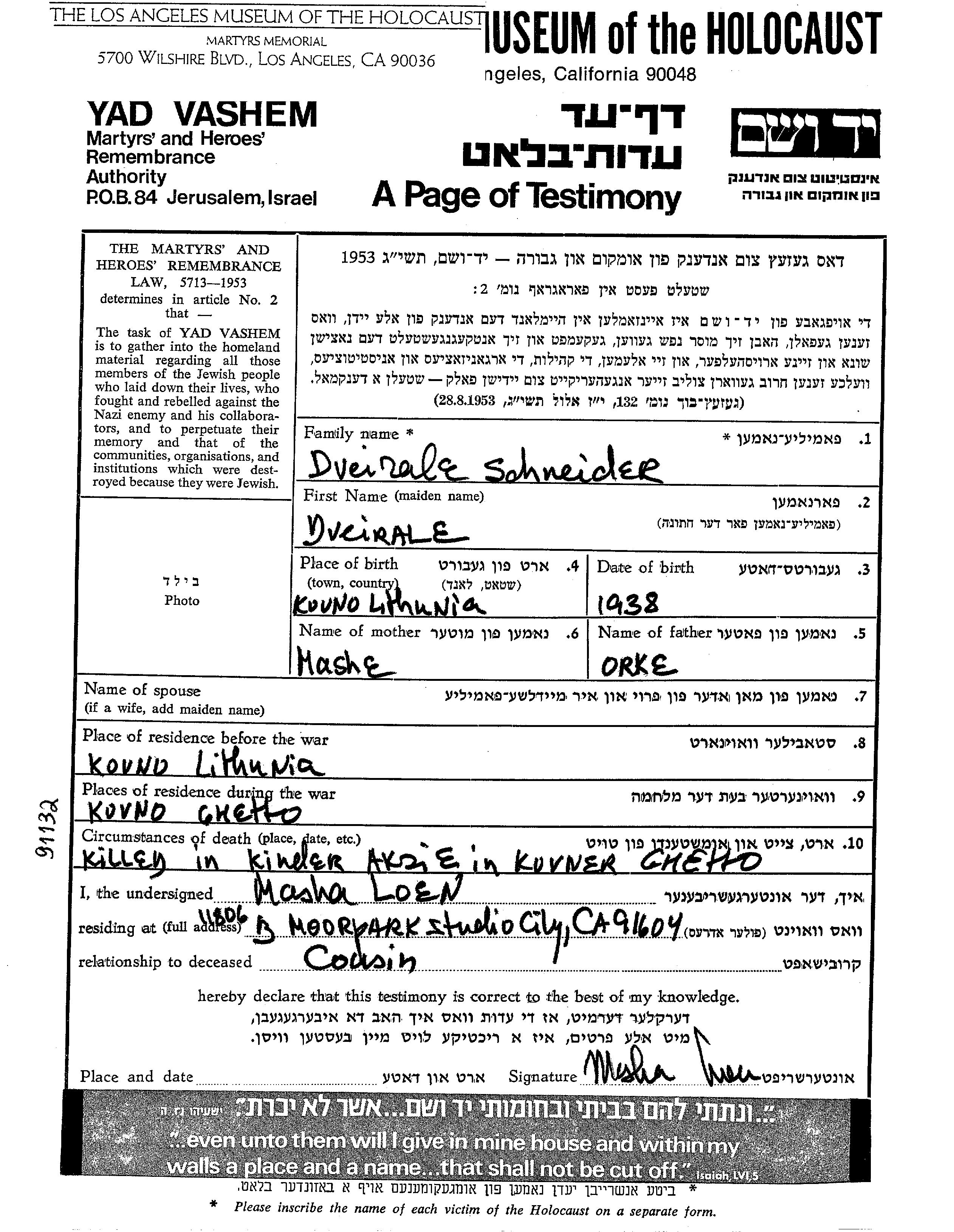 Dveirale Schneider est née à Kovno, Lituanie en 1938, fille de Orke et de Mashe. Elle était Enfant. Avant la seconde guerre mondiale elle vivait à Kovno, Lituanie. Pendant la guerre, elle était à Kovno, Lituanie.