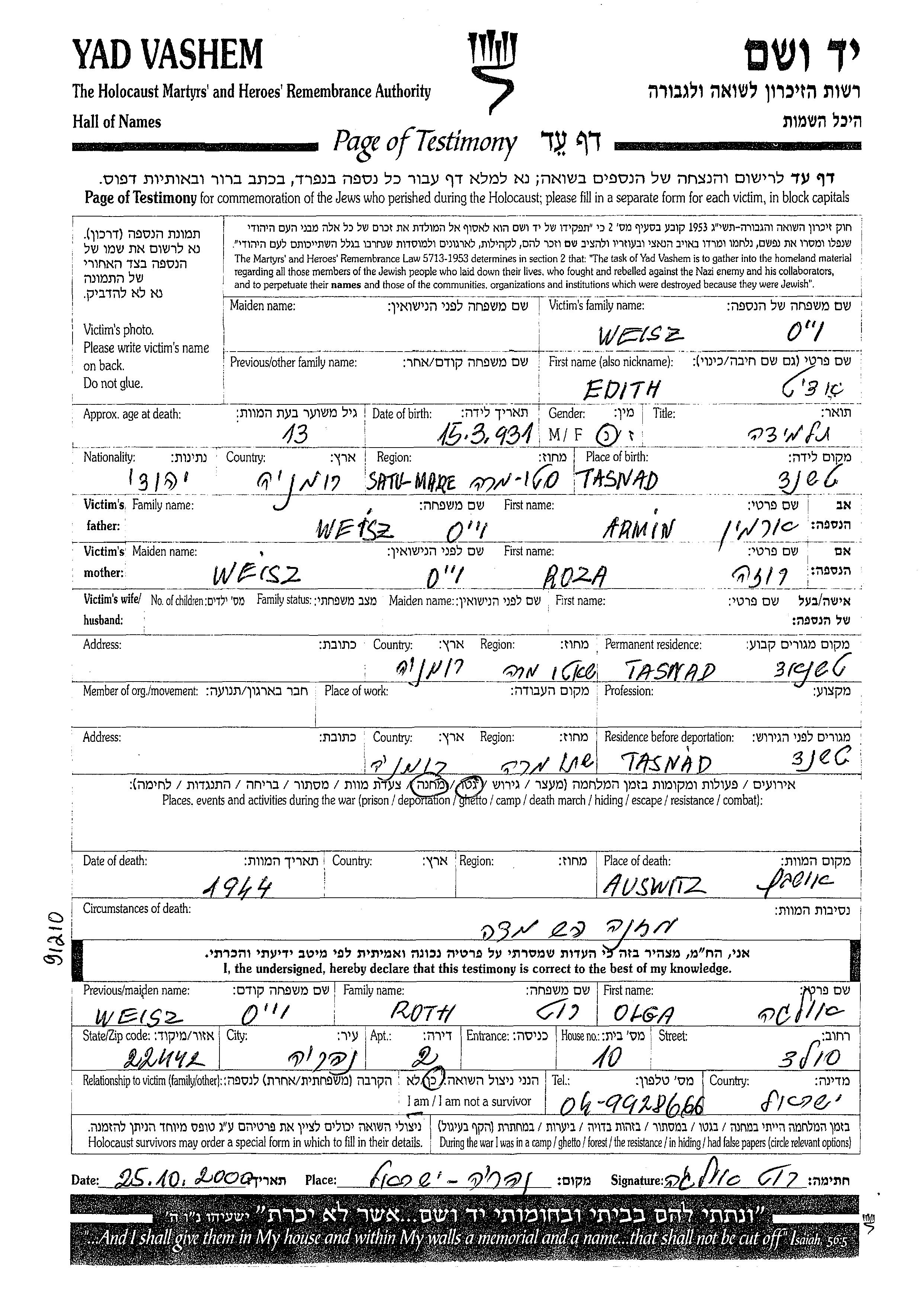 Weisz Edith 1931 Tasnad, Roumanie Feuille de témoignage
