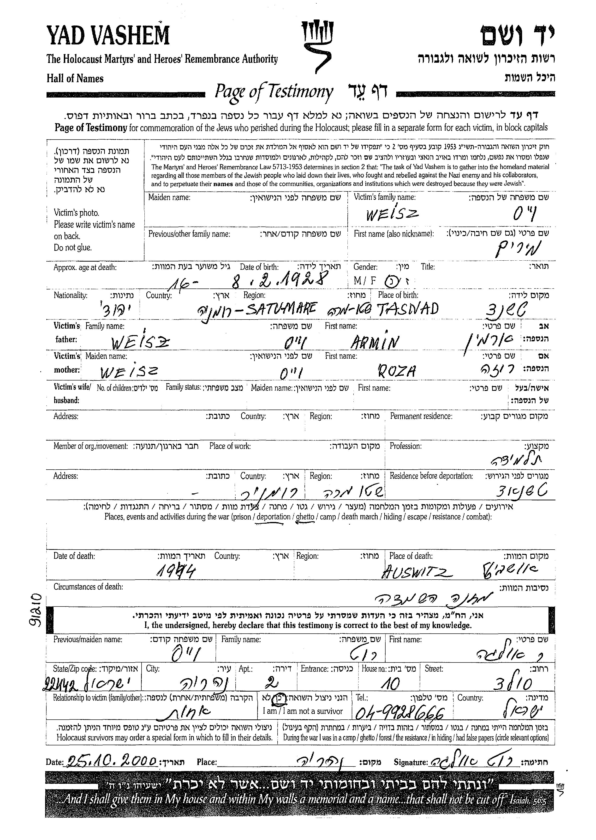 Yad Vashem - Pages of Testimony Names Memorial Collection